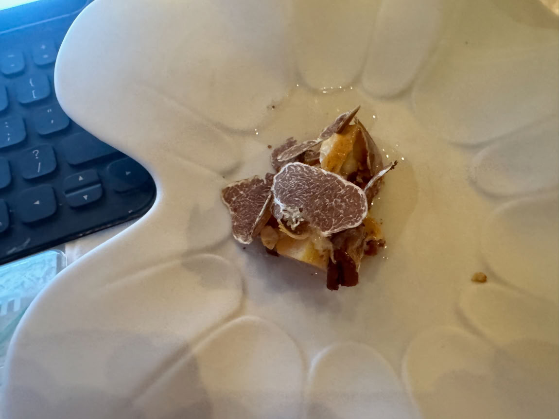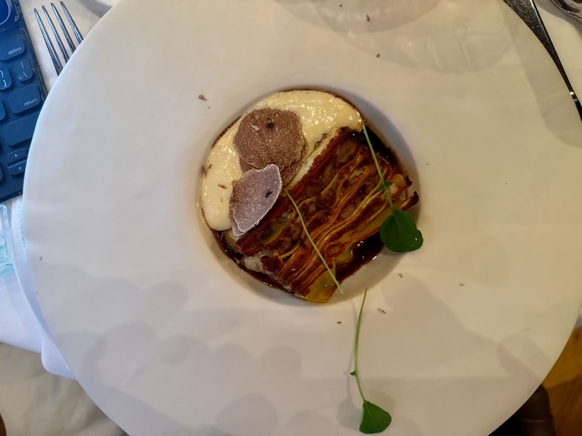 This “Mountain” lasagna has a white sauce that is like nothing we’ve ever seen before. The white ragu has a lot of nutmeg in it, and since the dish is hot, the truffle is really intense. Each slice is crisp around the edges. Bill says this dish ties with the lamb agnolotti we had at the 2014 Truffle dinner.