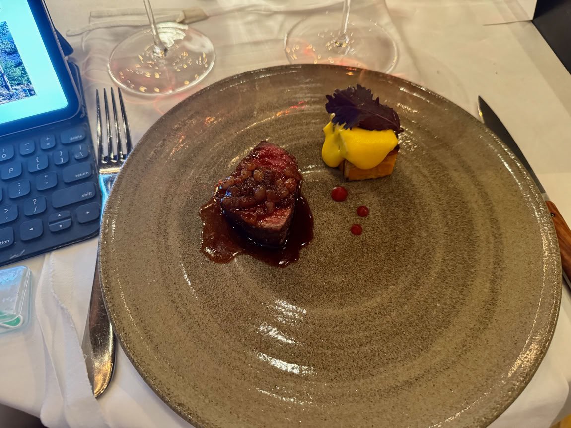 The American Wagyu at the left, the squash and potato sabayon on the right. Martin says, “Sigh, its still just squash”.