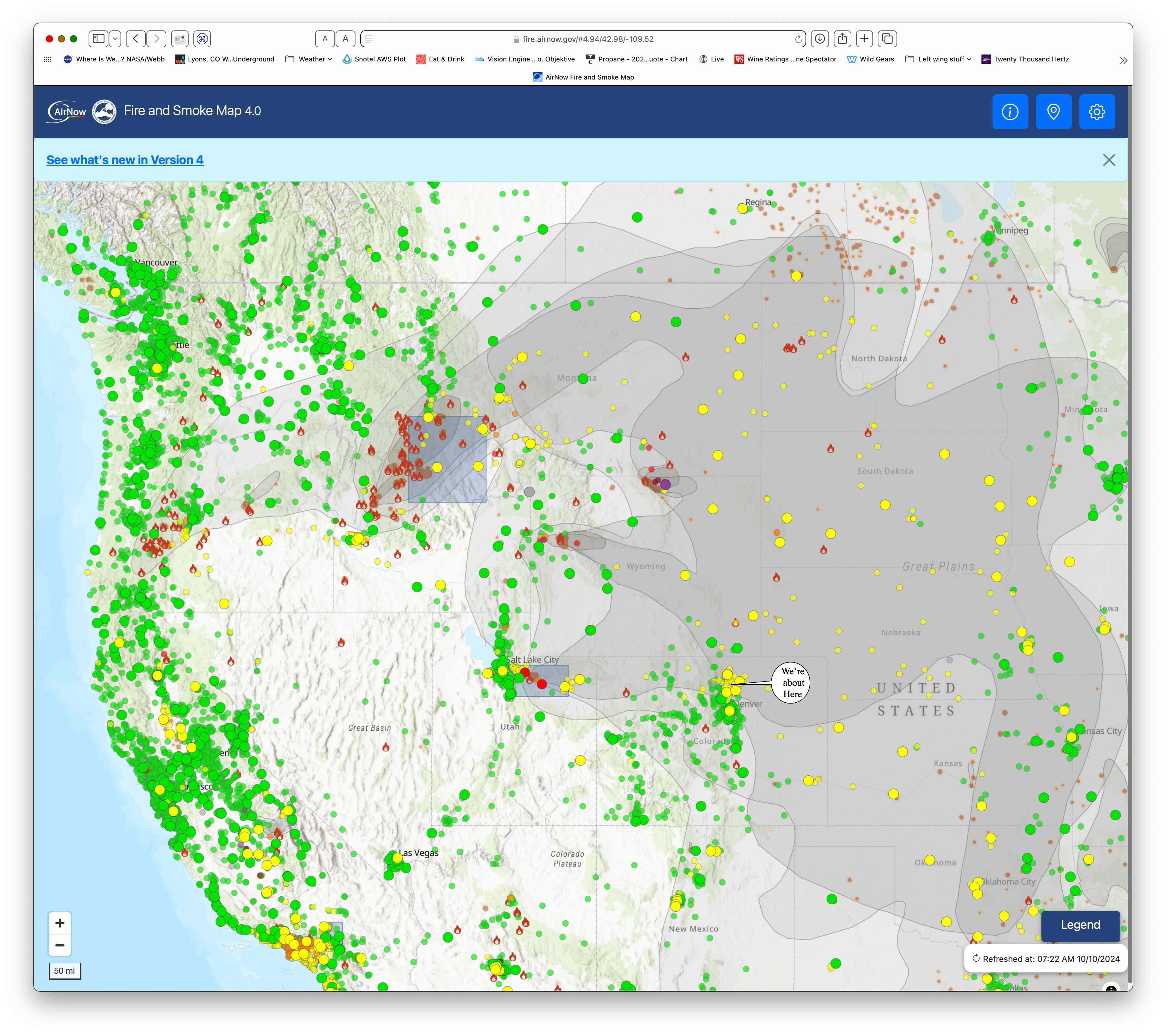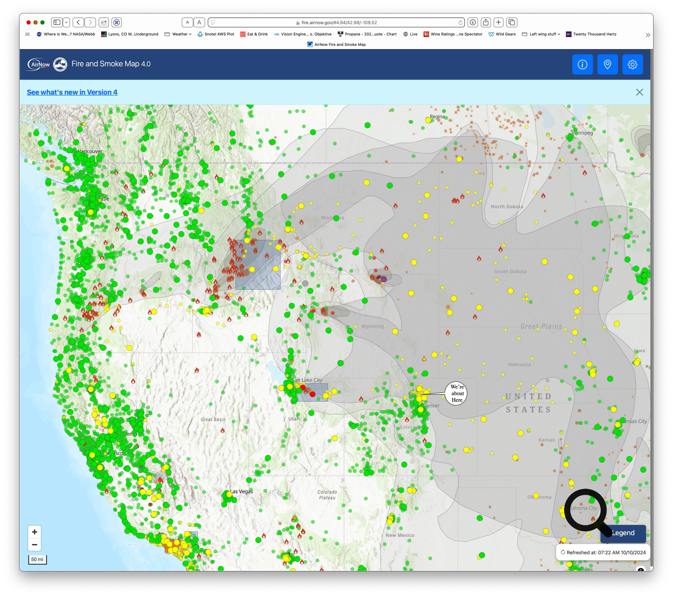 The smoke map. The starting URL is https://fire.airnow.gov. Once you let it use your geoloc then it tacks on some internal stuff on it. You can see that all the air quality stations around us are reporting yellow air quality. Once you move out to the level 3 band, they mostly go back to green.