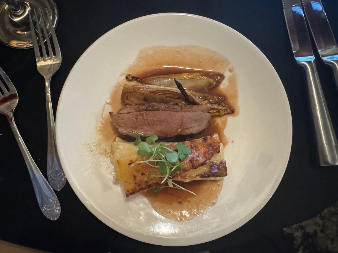 The Chef, “This is the duck course so you’ve got a roasted duck that is served with a pan, seared Belgian endive and a potato dauphinois so the sauce on the bottom is a very slow cooked red wine sauce, and we use the wine from this course to make the sauce for the duck.