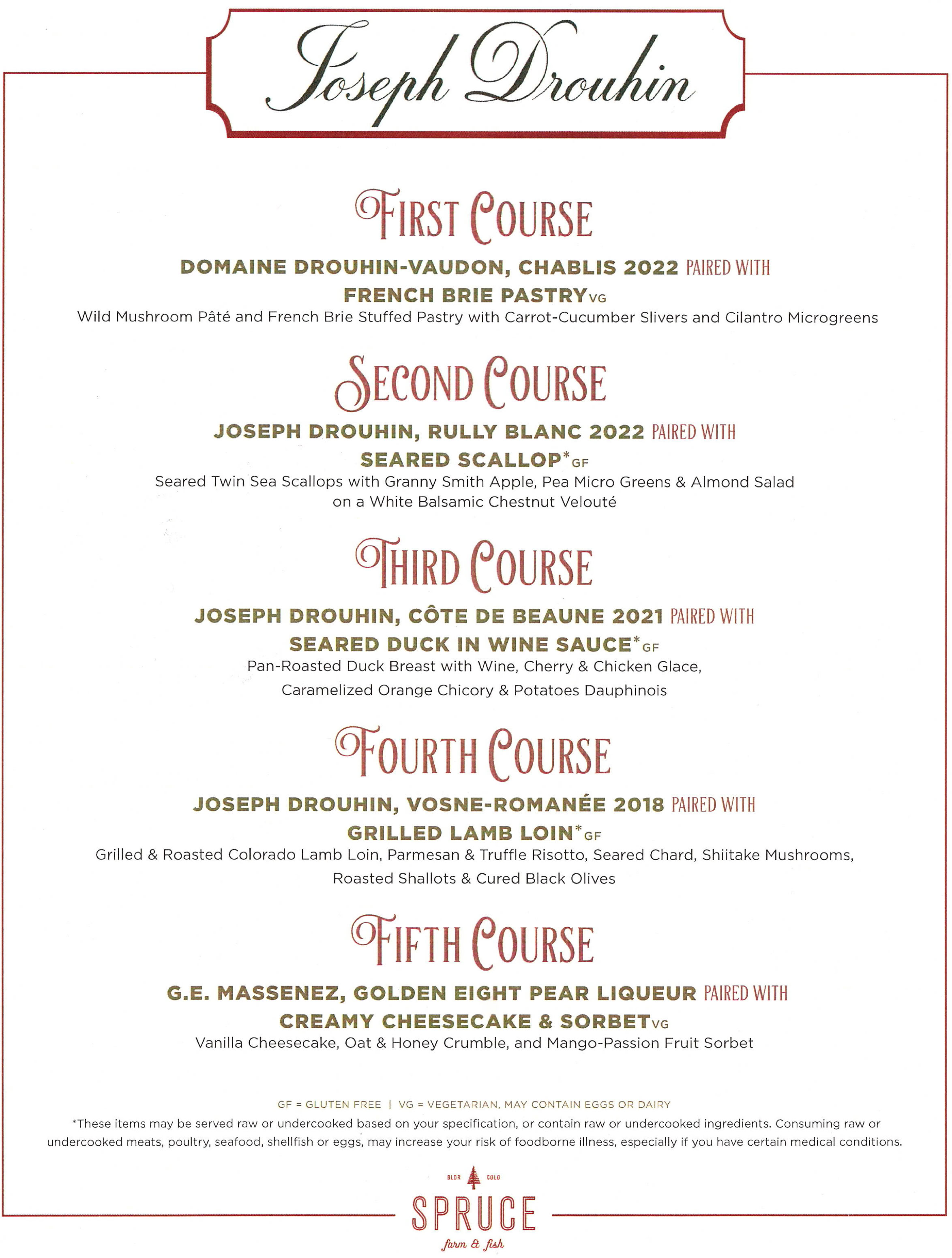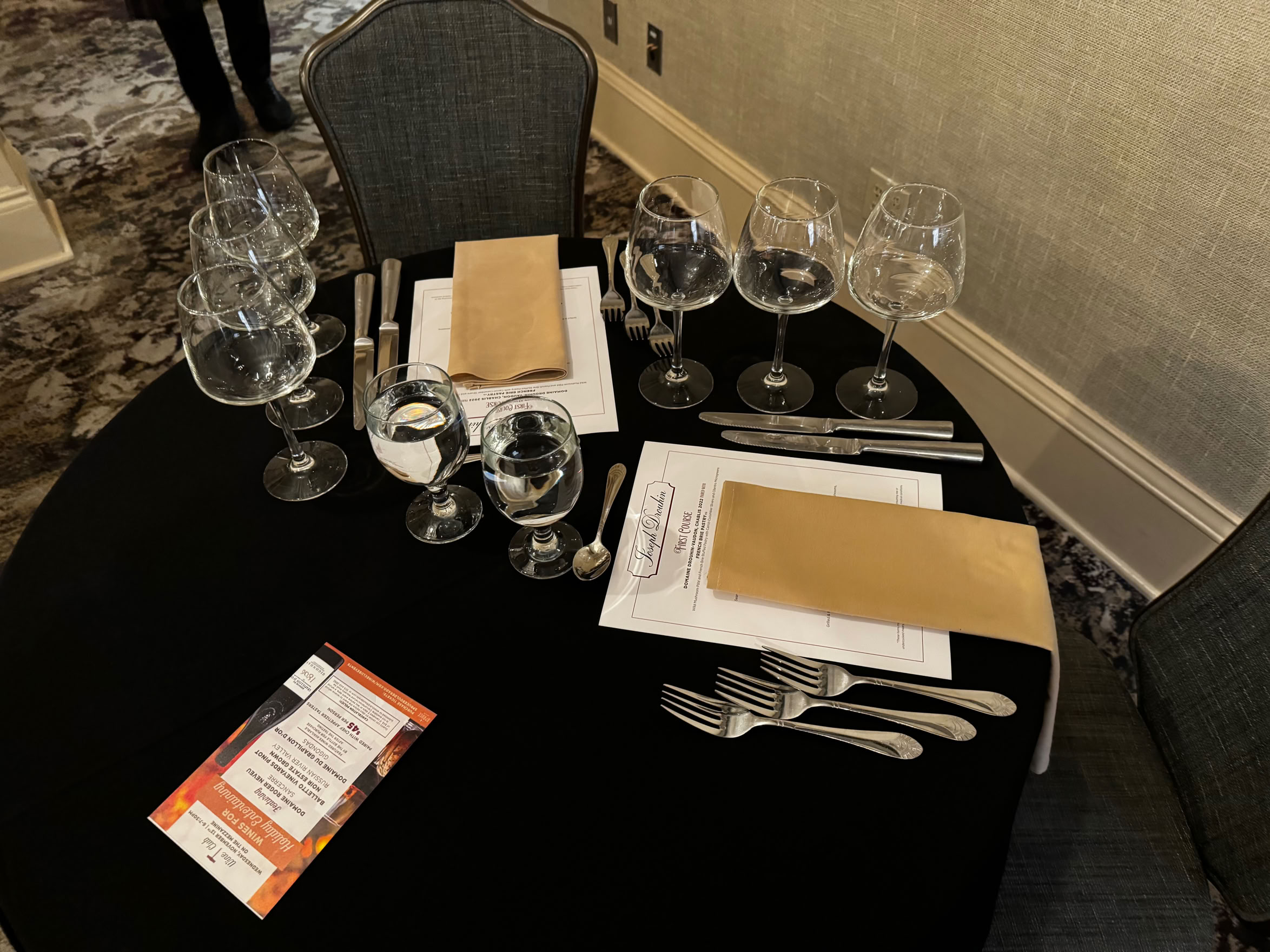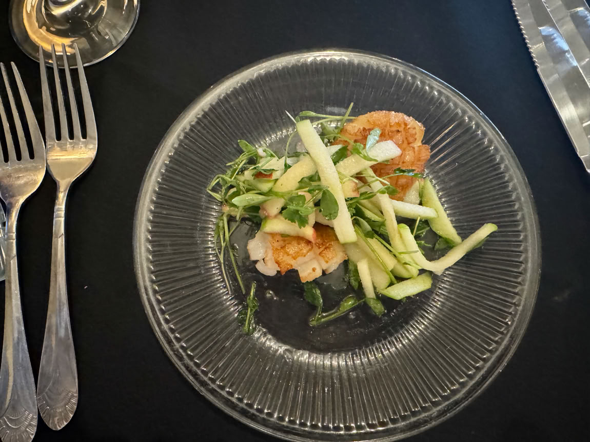 There were enough of us at the event so that the staff had to hurry a bit with each flight and Martin couldn’t get pictures of each wine. The description on the menu of the wine paired with this doesn’t exactly match Joseph Drouhin’s web site, but it was probably the Chablis Réserve de Vaudon 2022 (https://www.drouhin.com/en_US/wine/chablis-reserve-de-vaudon/2022) Their description of it was right on:
