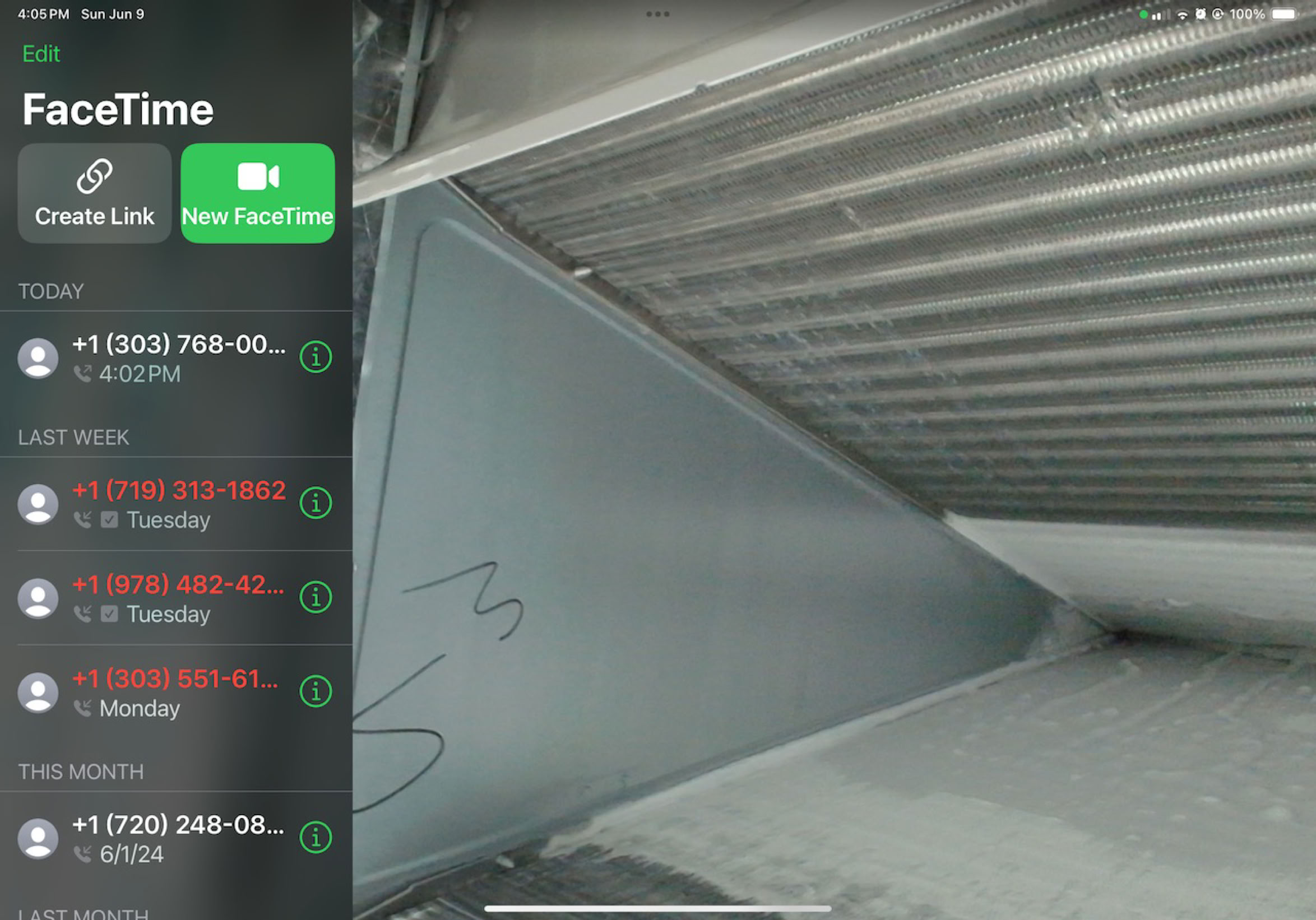 This is from June 9, 2024 (told you the Sandberg is slow!). Here’s the problem, the Rheem’s evaporator coil is iced up. Why all the Facetime stuff? This was shot with Logitech’s new 4K web cam (https://www.logitech.com/en-us/shop/p/4kprowebcam.960-001390) hooked up to Martin’s iPad. For some reason Apple’s camera app can’t deal with an external camera so Facetime had to be used. Actually seeing the evaporator coil isn’t easy. We attached the camera to a flexible selfie stick to maneuver it down to where it could see it. We also had to put a light in there becaused ducts are dark!
