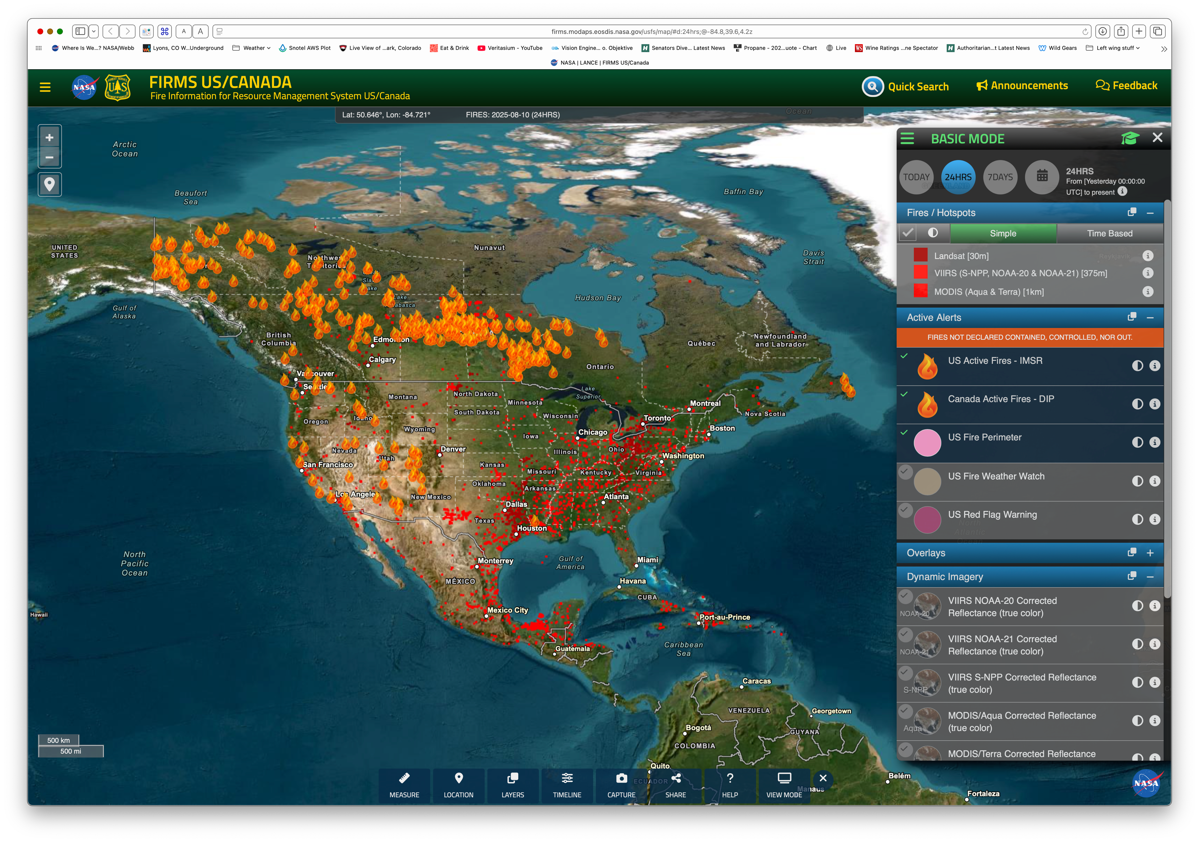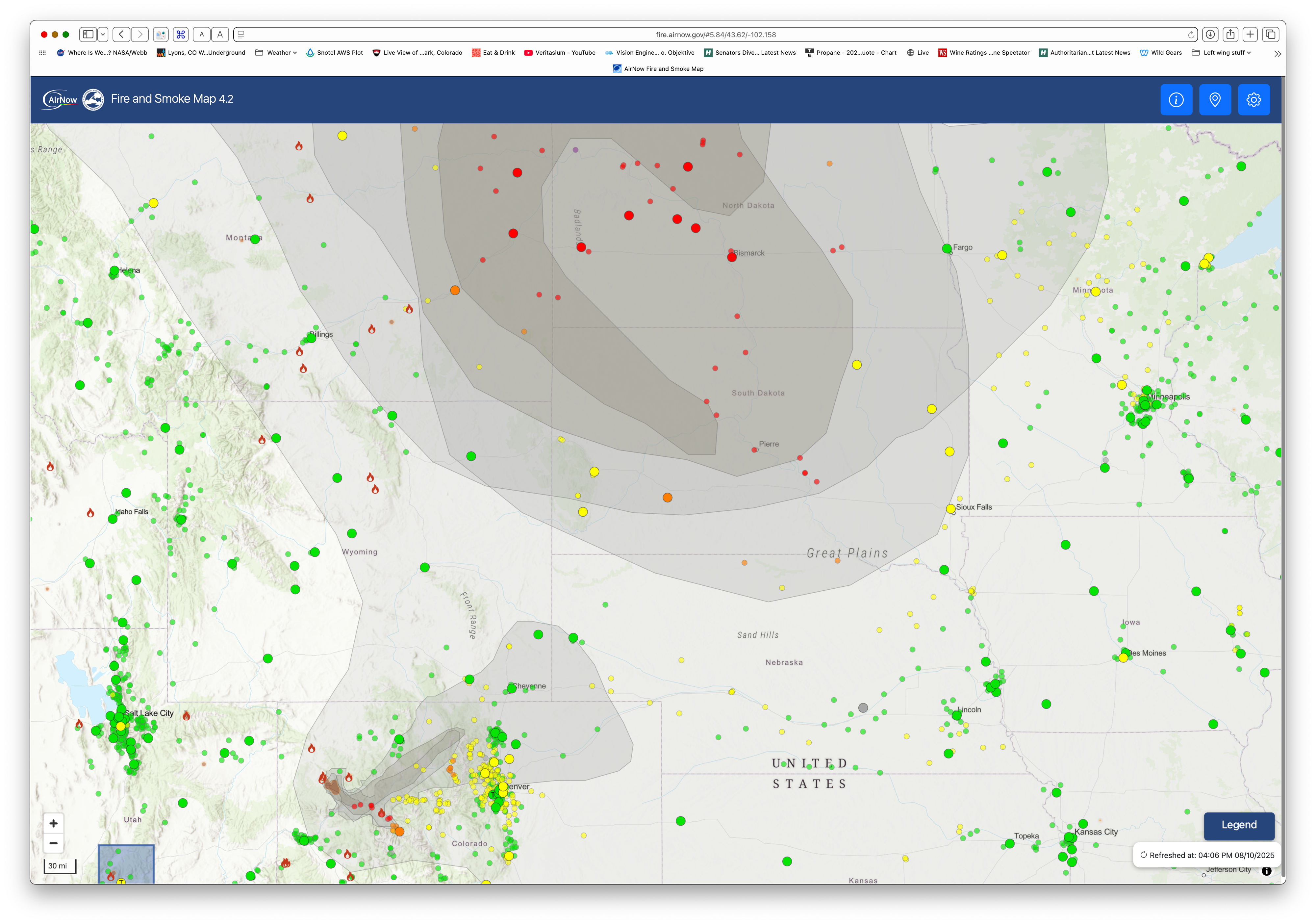 Right in the middle is Denver and you can see the fires on the west slope. They’re small, so the smoke plumes aren’t very big. Map is at https://firms.modaps.eosdis.nasa.gov/usfs/map/#d:24hrs;@-103.6,38.4,6.3z .