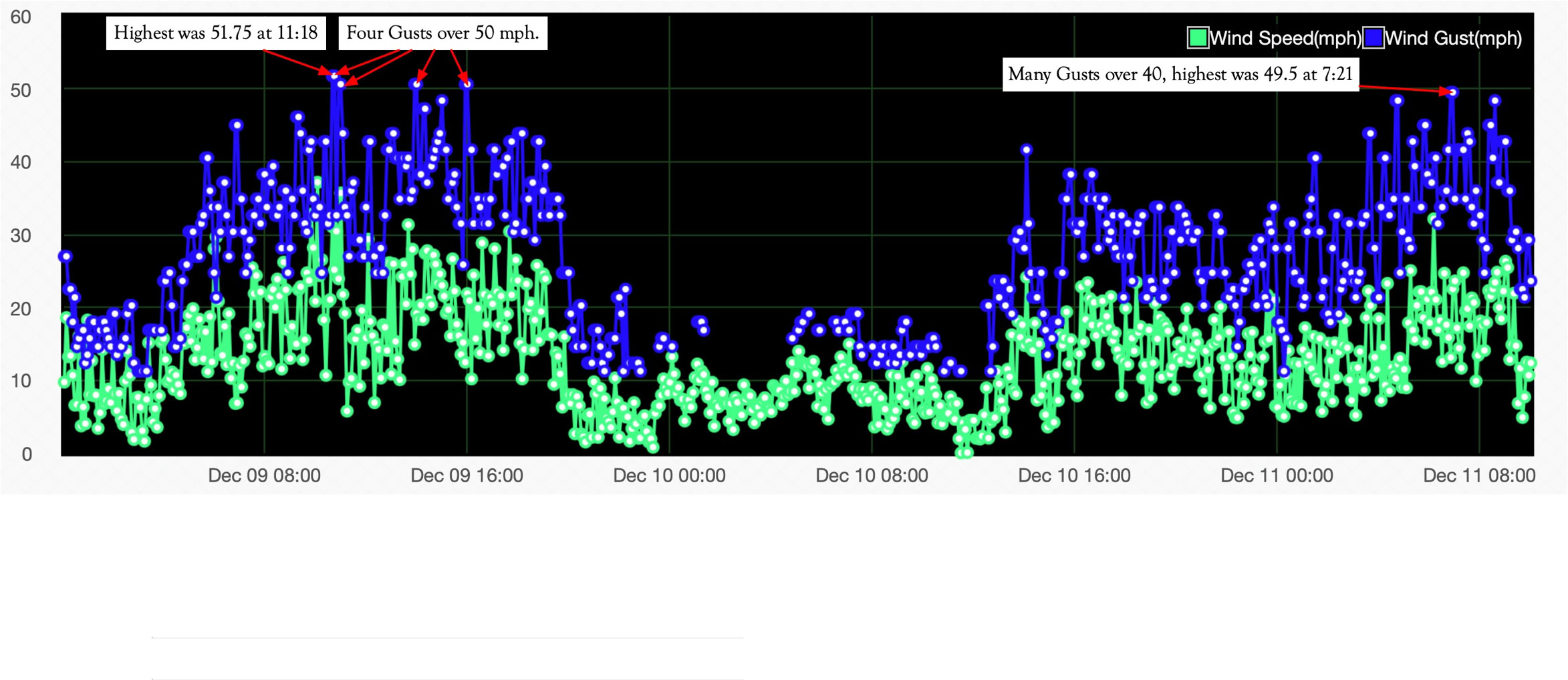 The wind on the 9th really got going about 7:00, with four gusts over 50 mph! Then today it started a little later.