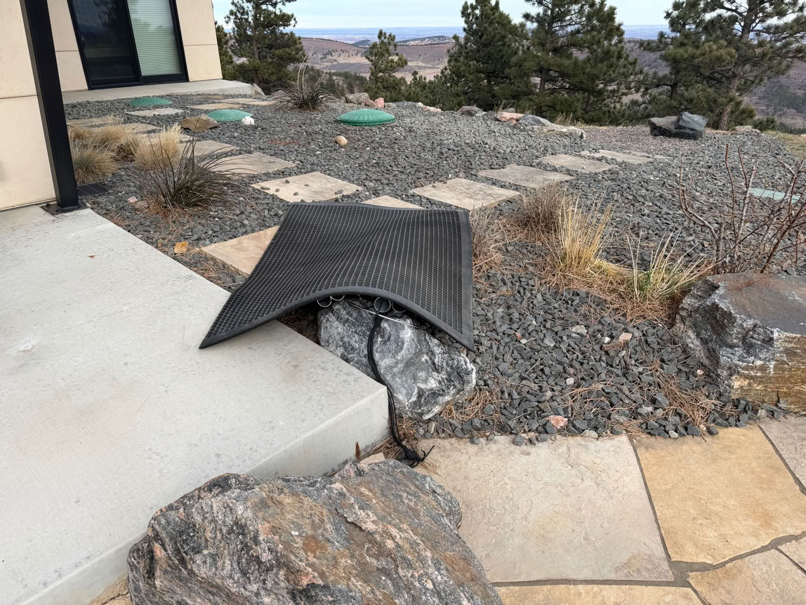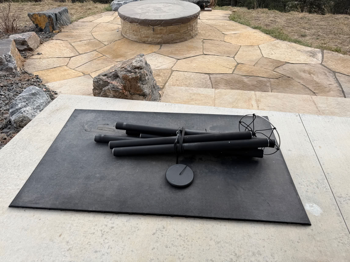 Here’s what the wind chimes looked like before the high winds. This was actually taken today at 2:07, We didn’t think that heavy rubber mat could possibly be moved! It takes both of us to move it, since it weighs 60 to 70 pounds. The chimes themselves weigh 45 pounds.