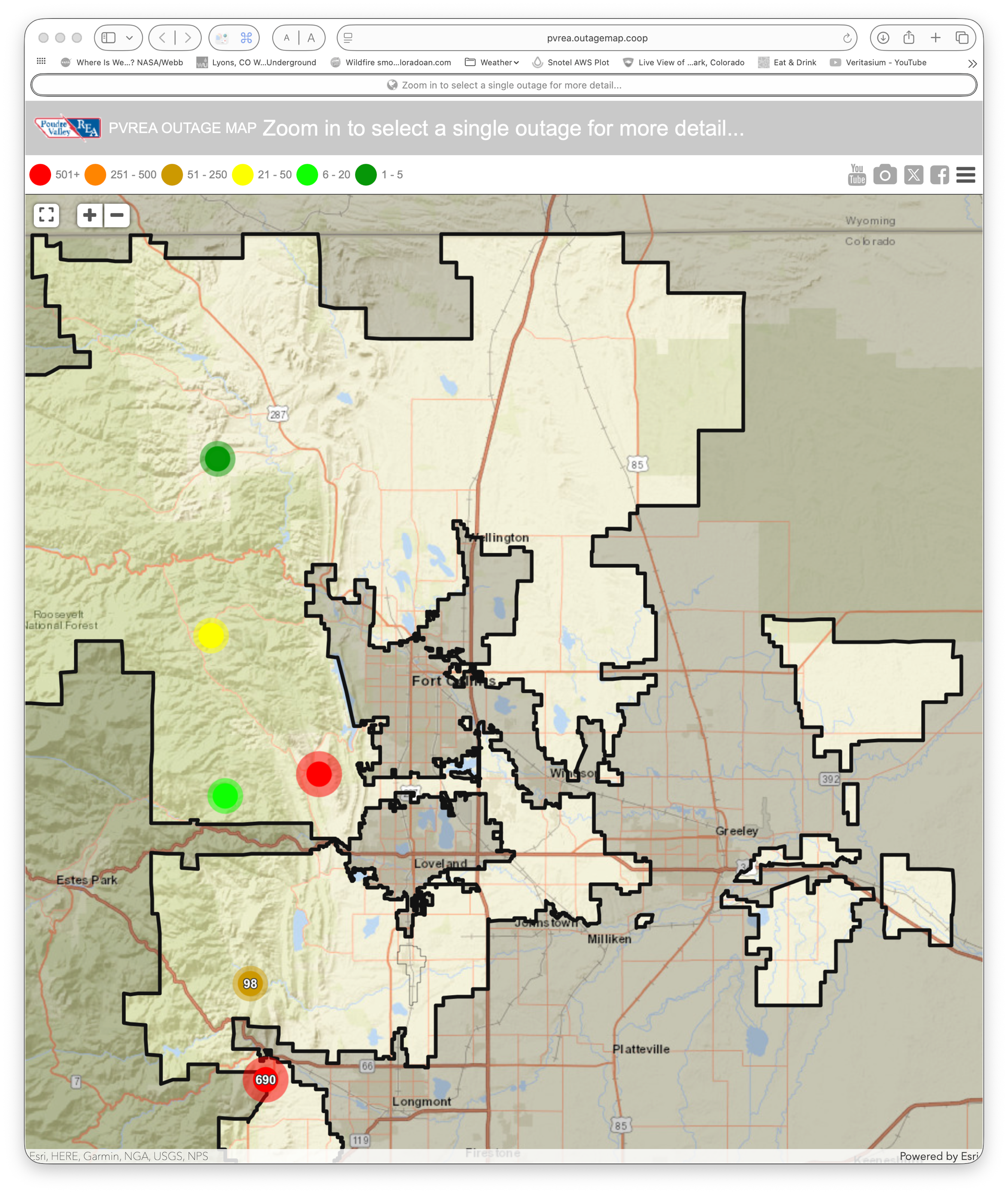 This is PVREA’s outage map at 2:10 PM. We’re in the brown spot showing 98 customers affected at the lower left.