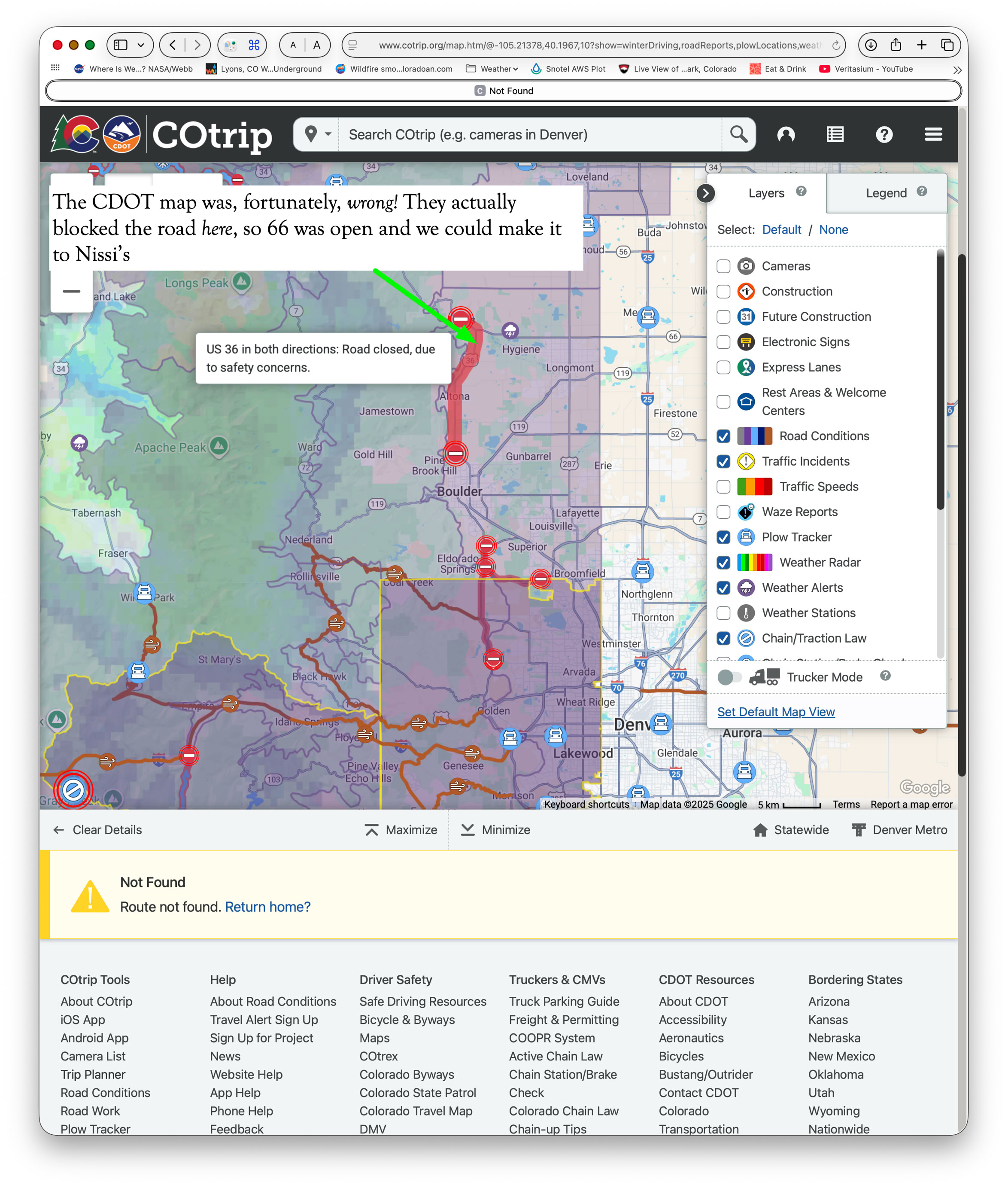 This is CDOT’s road closure map. They still had 36 closed when we were going to Nissi’s.