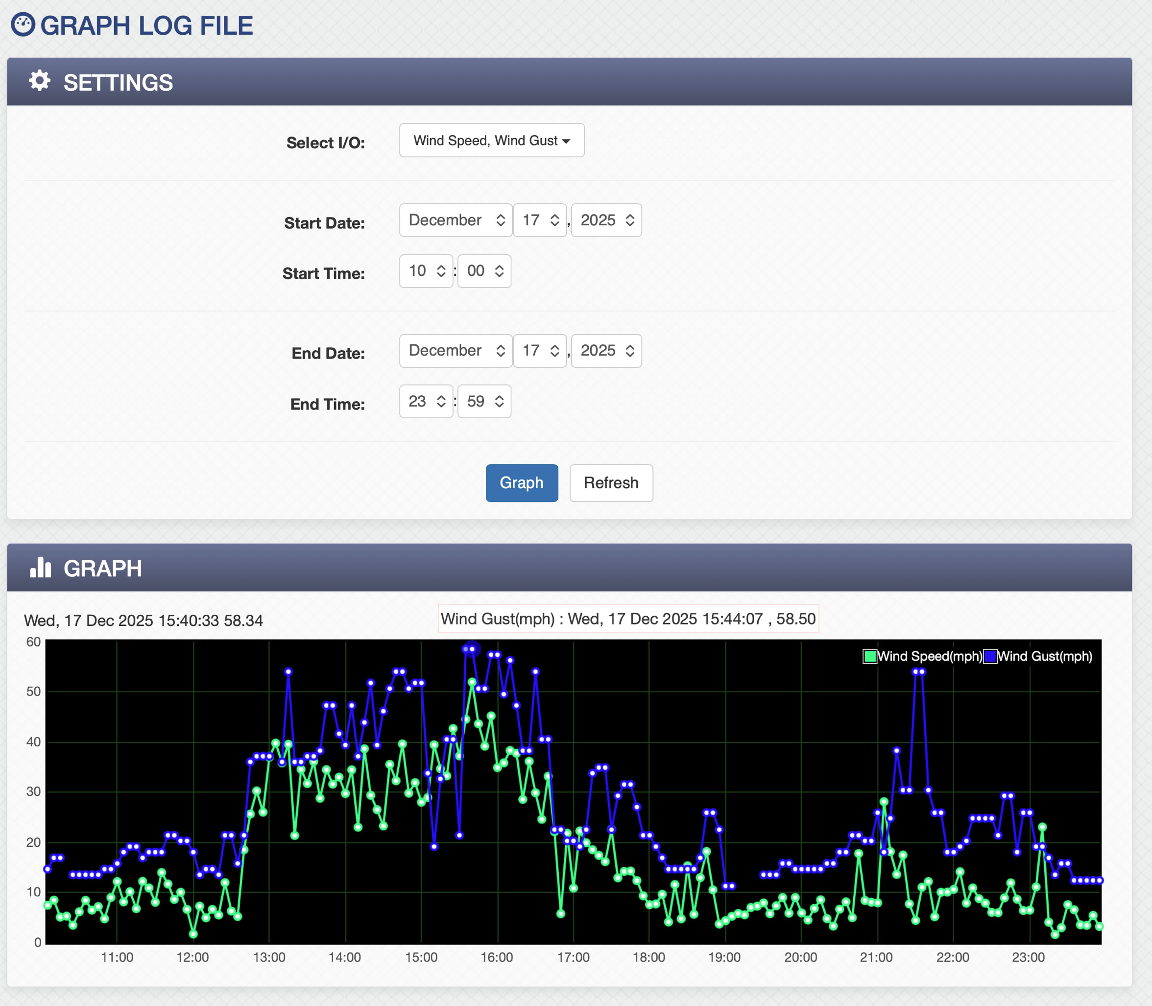 Here’s the weather stations plot, it shows a peak of 58.5 mph. The difference in top wind gust velocity is due to the slightly different log times. The weather station’s own log times don’t happen at the same time it sends data to Wunderground.