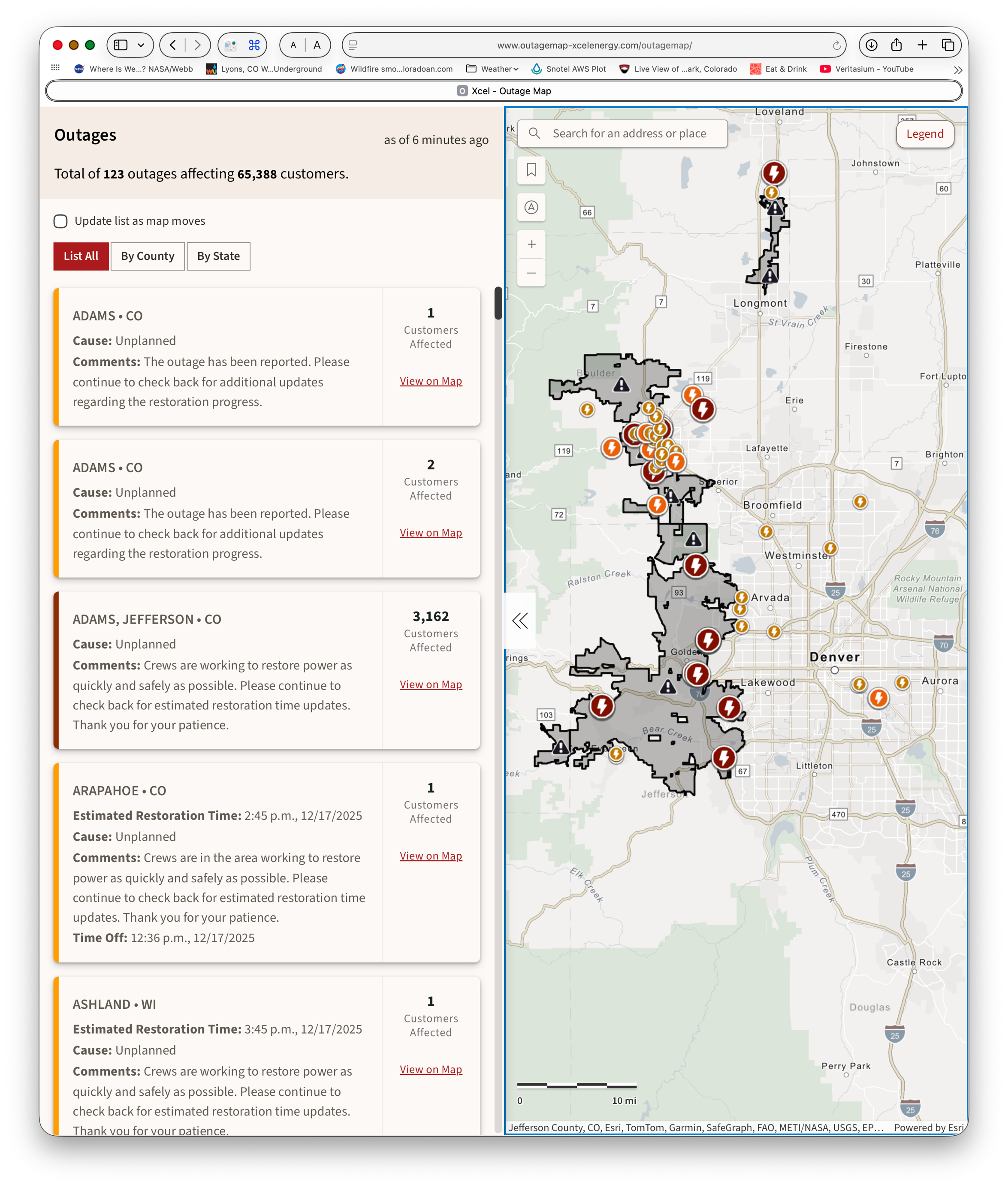 This is Xcel’s map at 2:16 PM showing huge outages all over the Denver metro area.