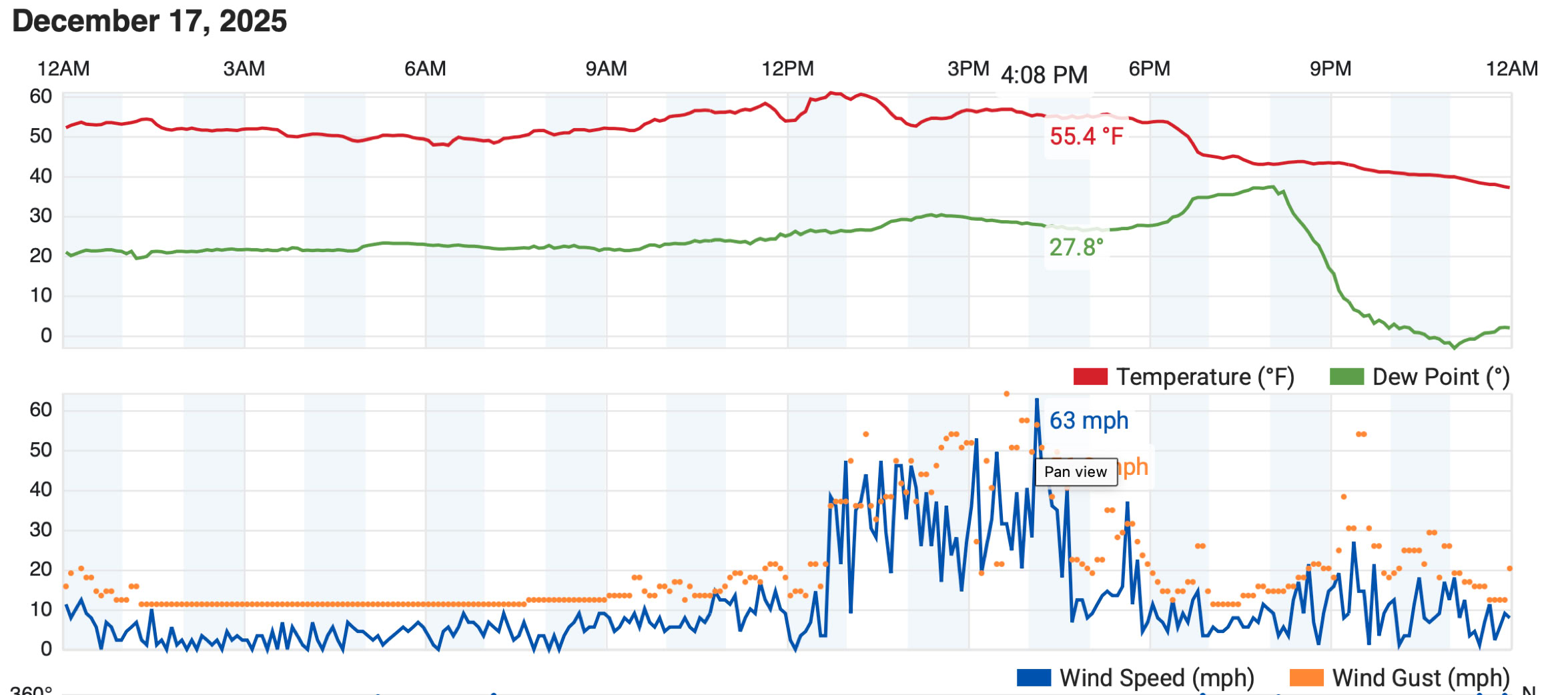Here’s Wunderground’s plot of the wind speed and gusts. They show a peak of 63 mph.