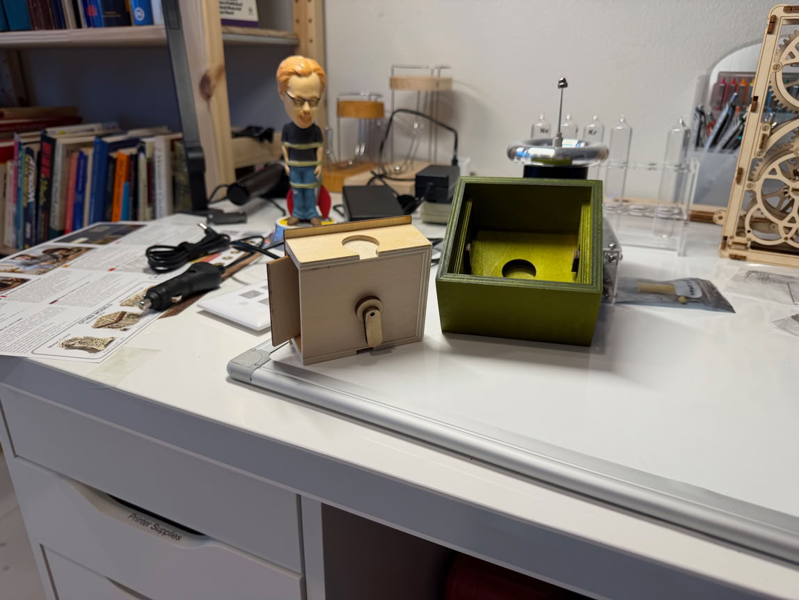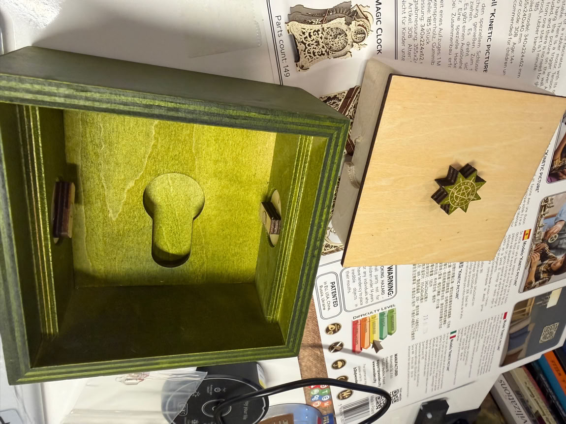 Eileen’s puzzle box after Martin solved it. One extra tricky bit is the locking mechanism on the bottom of the pull out box at the left. That you have to line up by using gravity to get it into the configuration shown. The only clue is that when its oriented correctly, the writing on the back of the outer, green box is right side up.