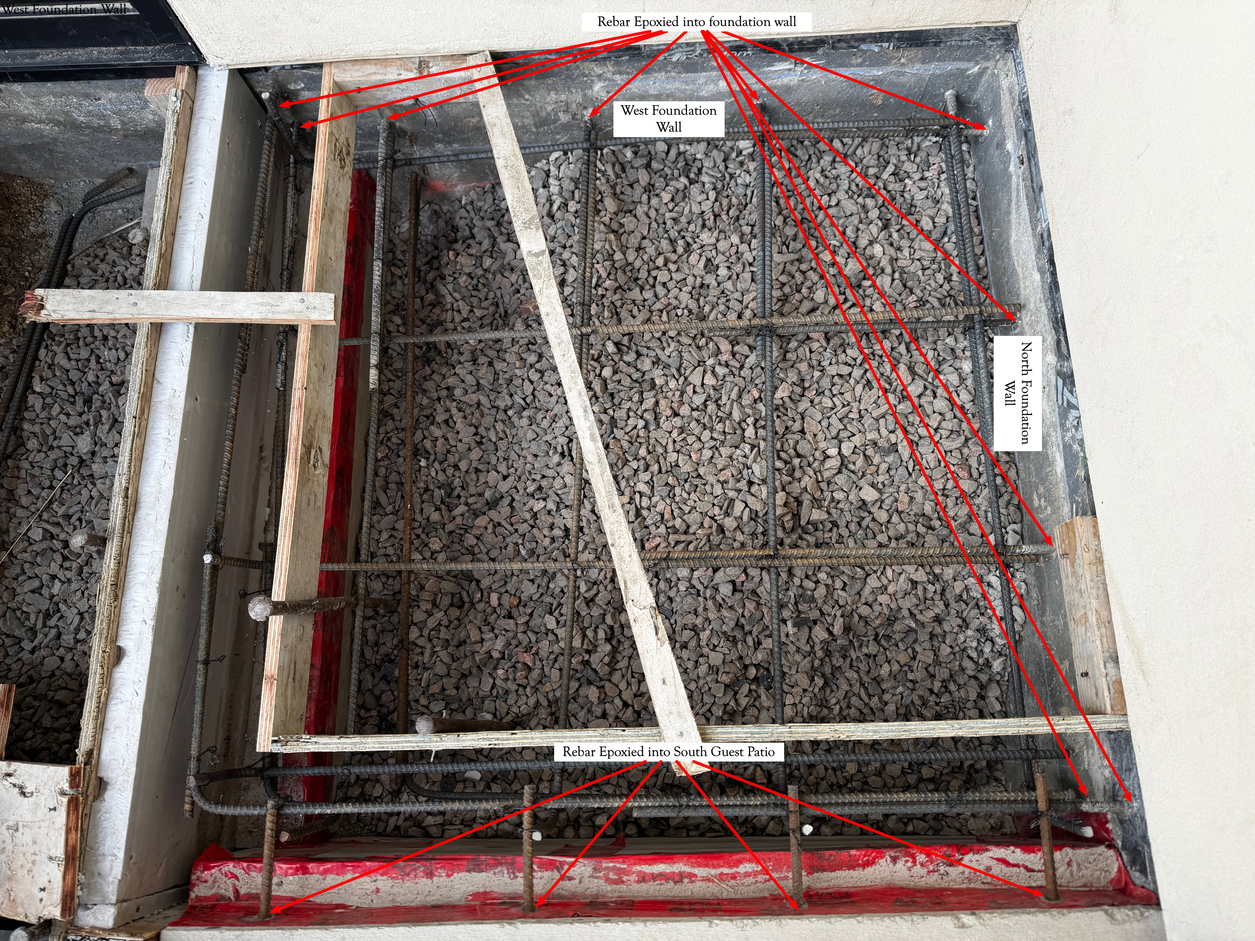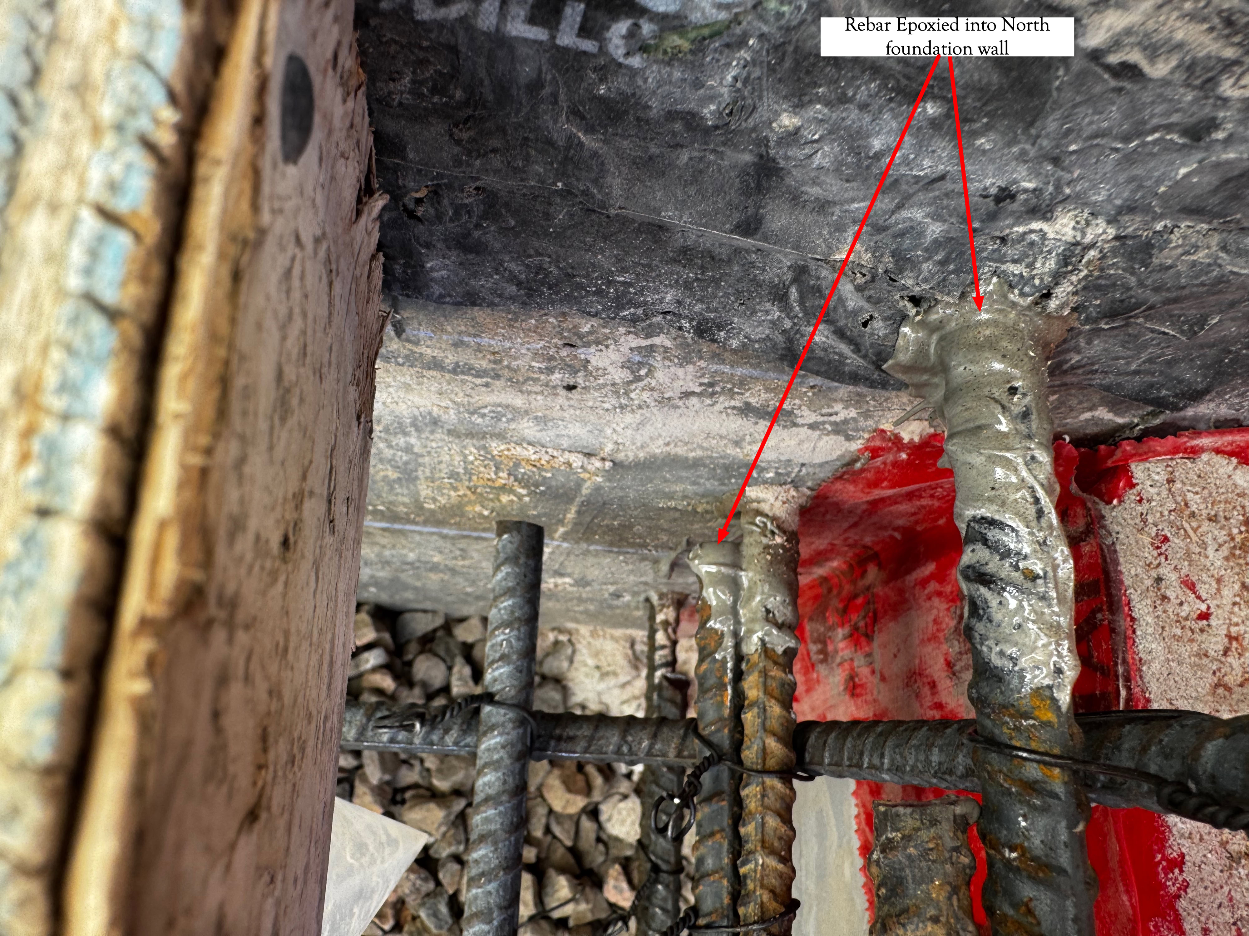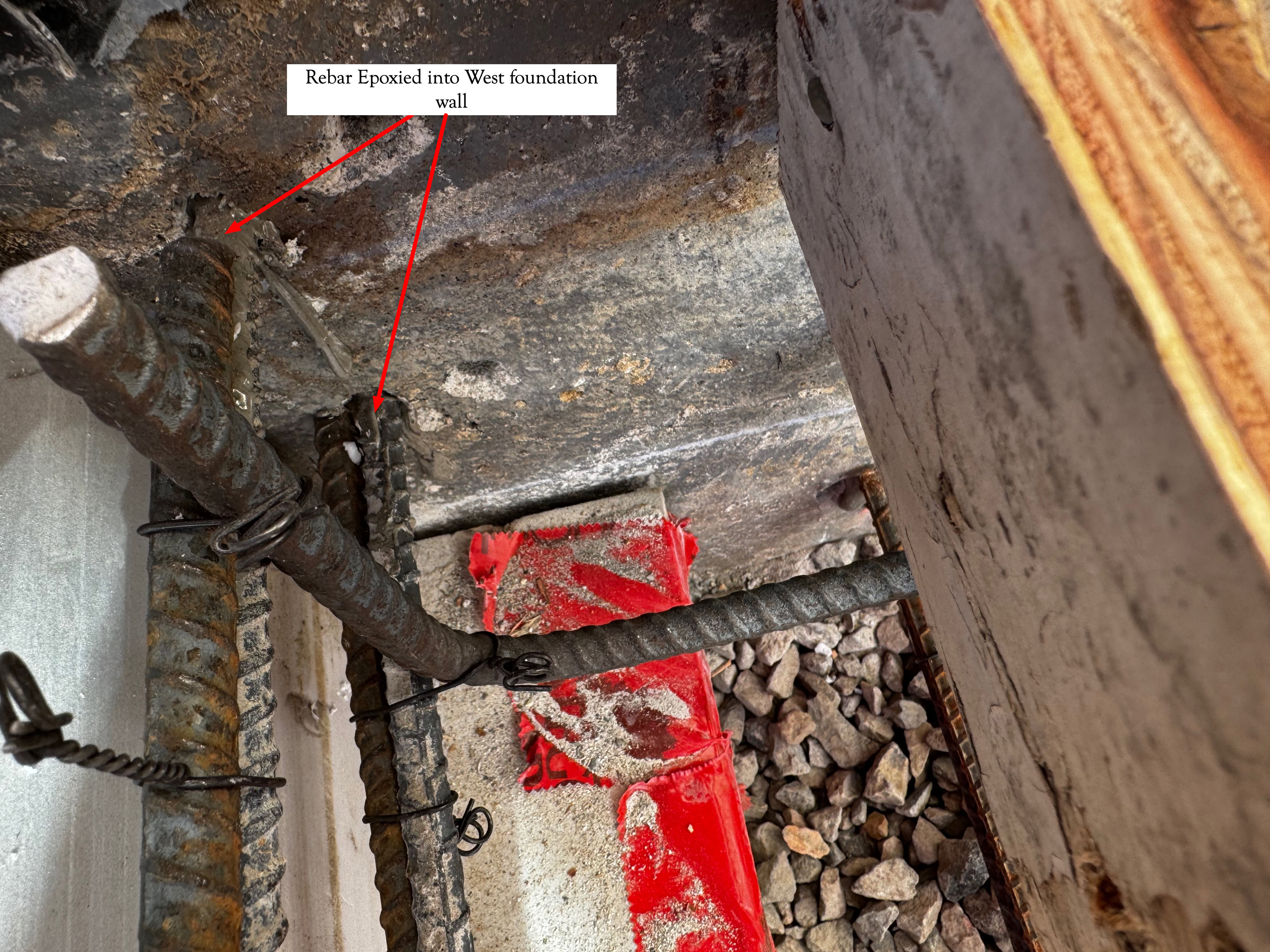 Martin wasn’t sure about how the curb rebar was connected to the foundation walls. So he took this close up of the west side. It turns out that both the top and bottom rebar are connected to the pins (Big rebar!) epoxied into the foundation walls.