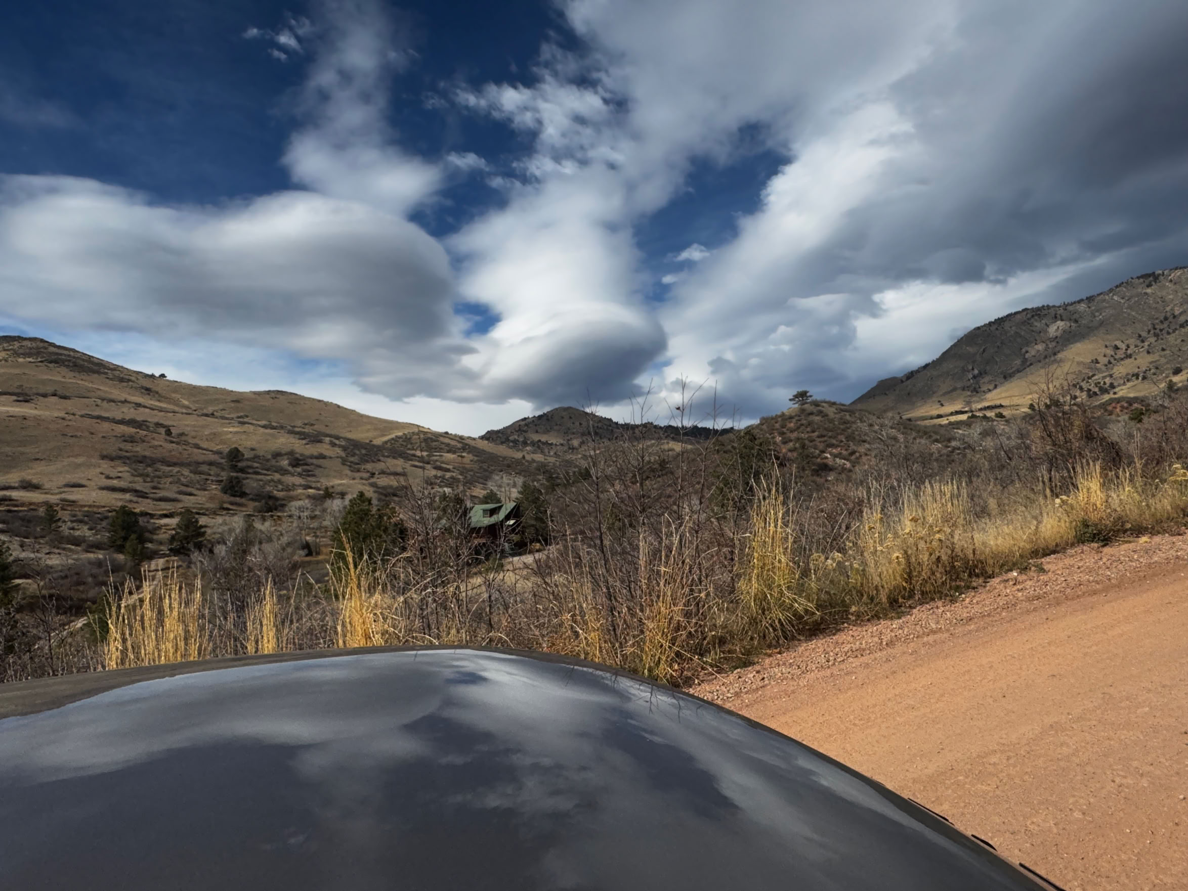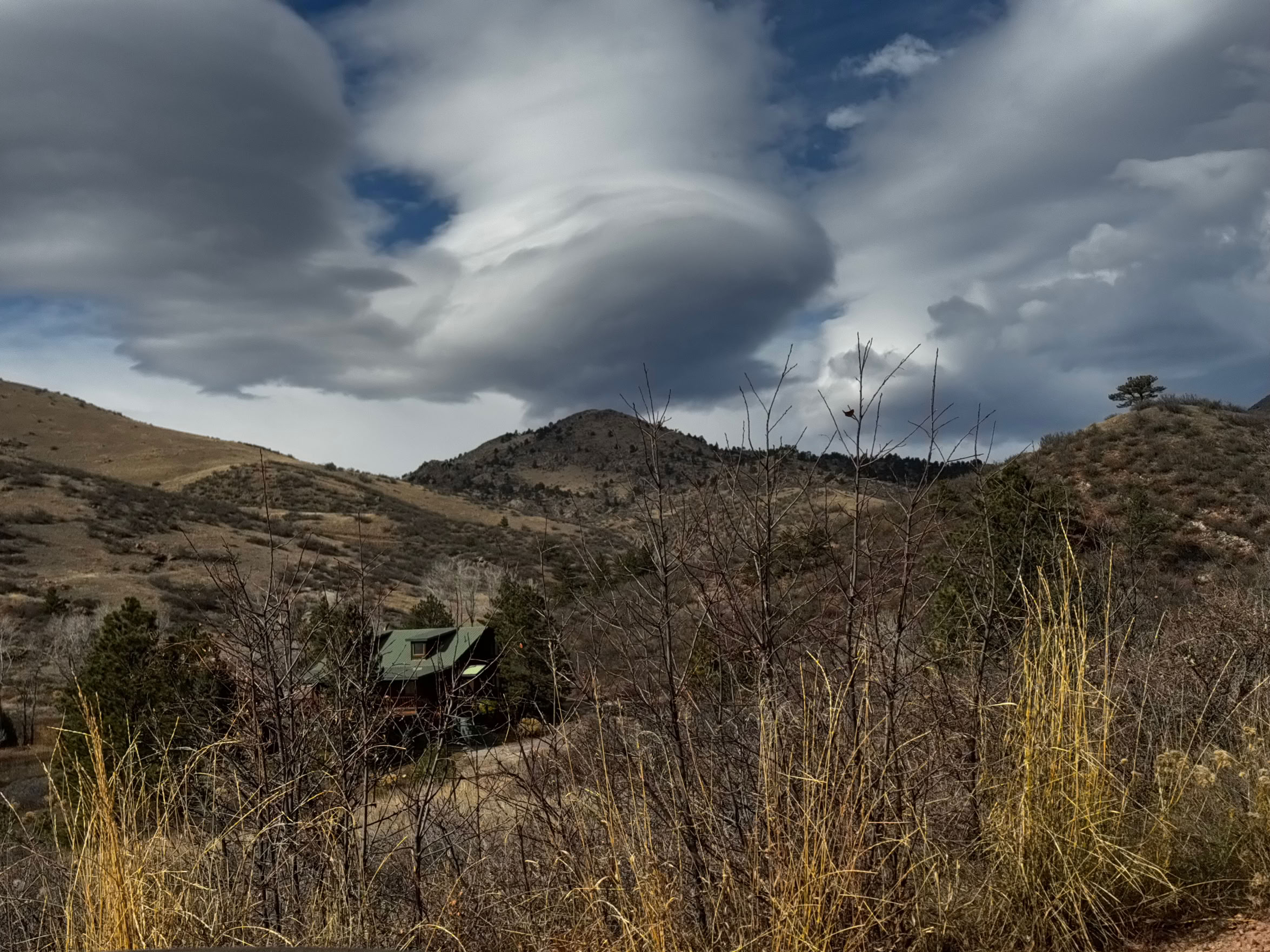 Here’s an overall view. Hmmm… Could this be a mountain wave just starting to form? Goldberry’s hood isn’t damaged, that just the reflection of the clouds.