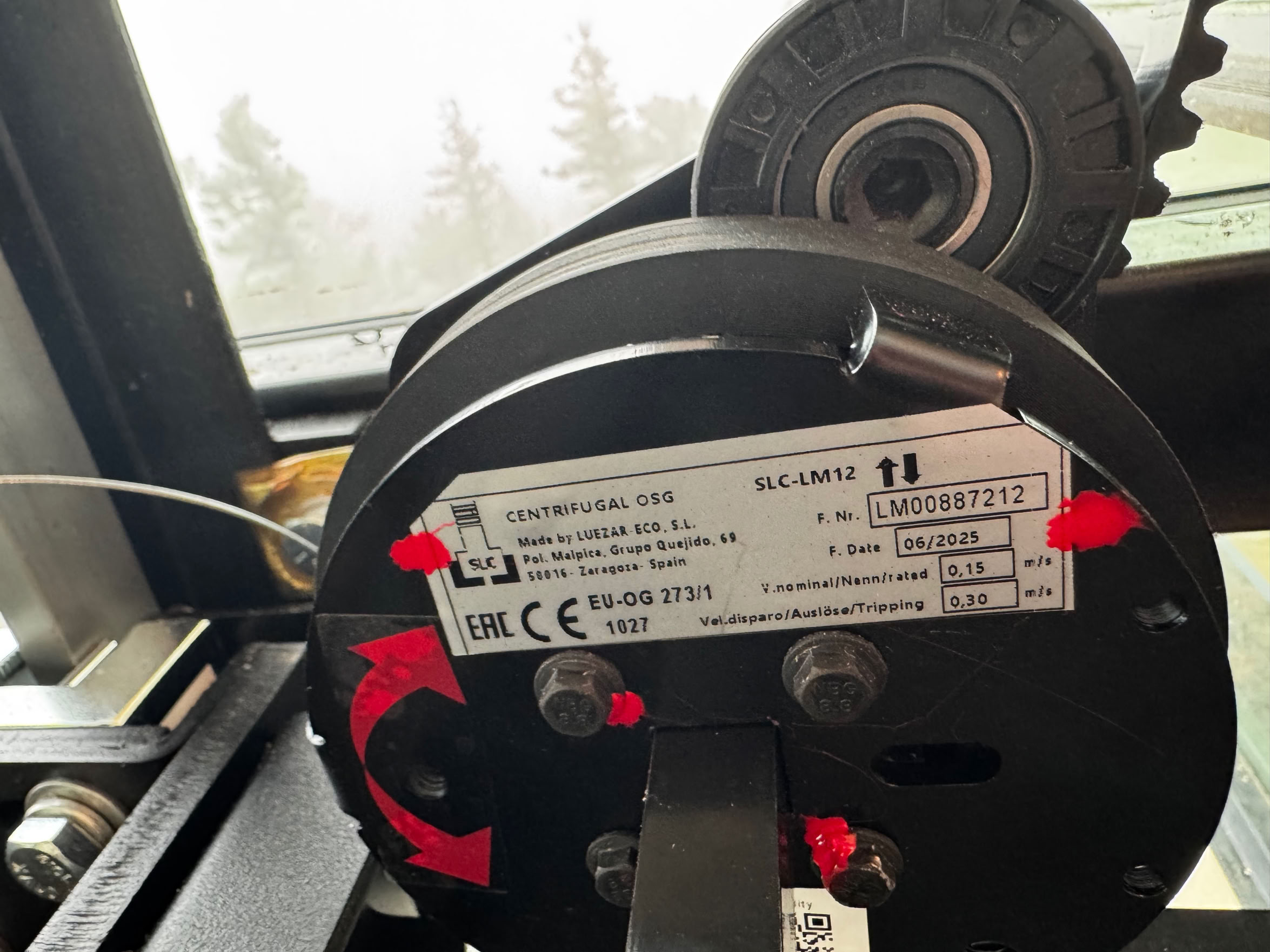 A better shot of the governor than Martin was able to get on Elevator assembly day 4. It expects the elevator to run at a nominal speed of 0.15 meters/second and shuts the elevator down if it sees the cab move faster than 0.3 meters/second.