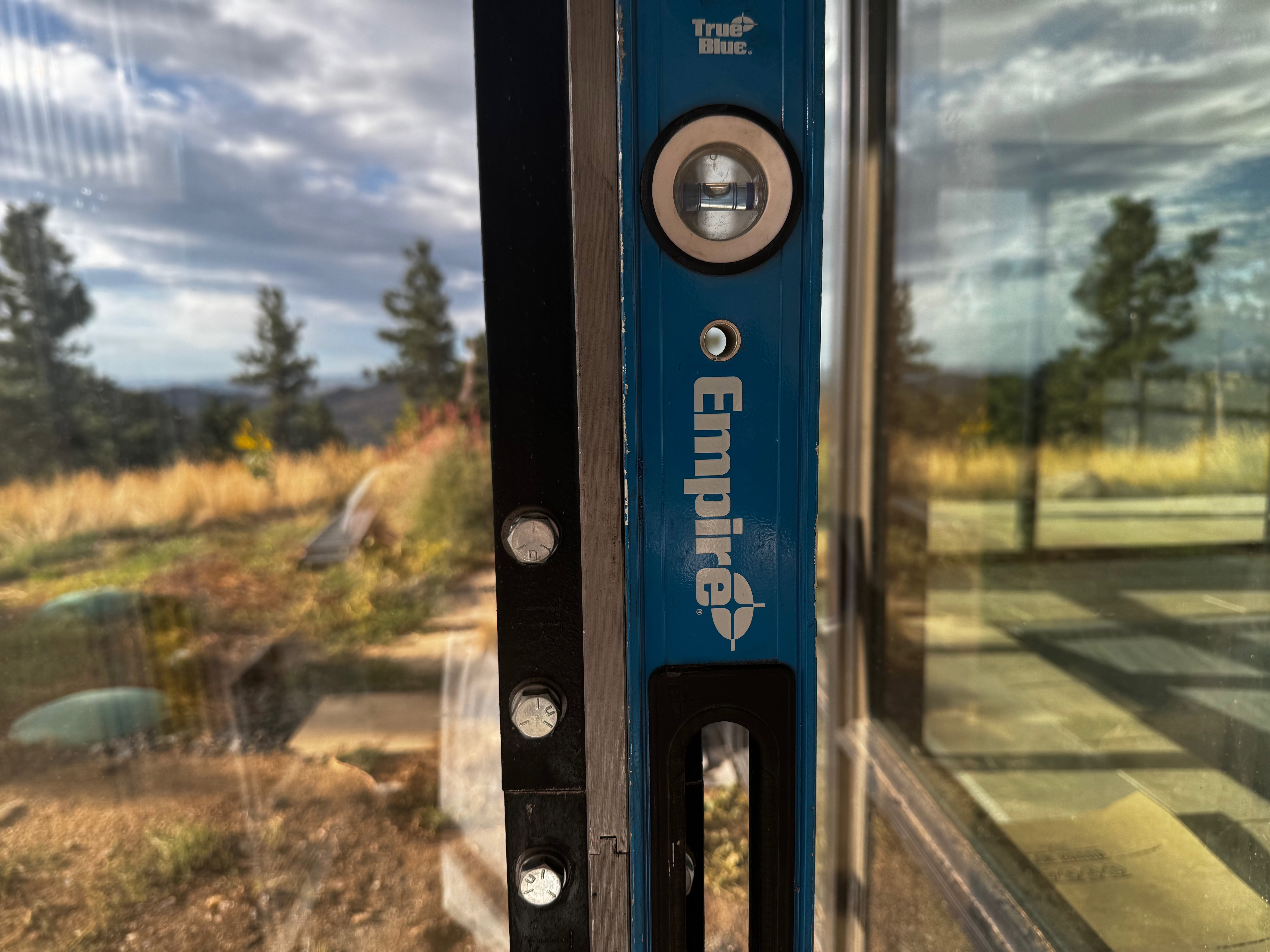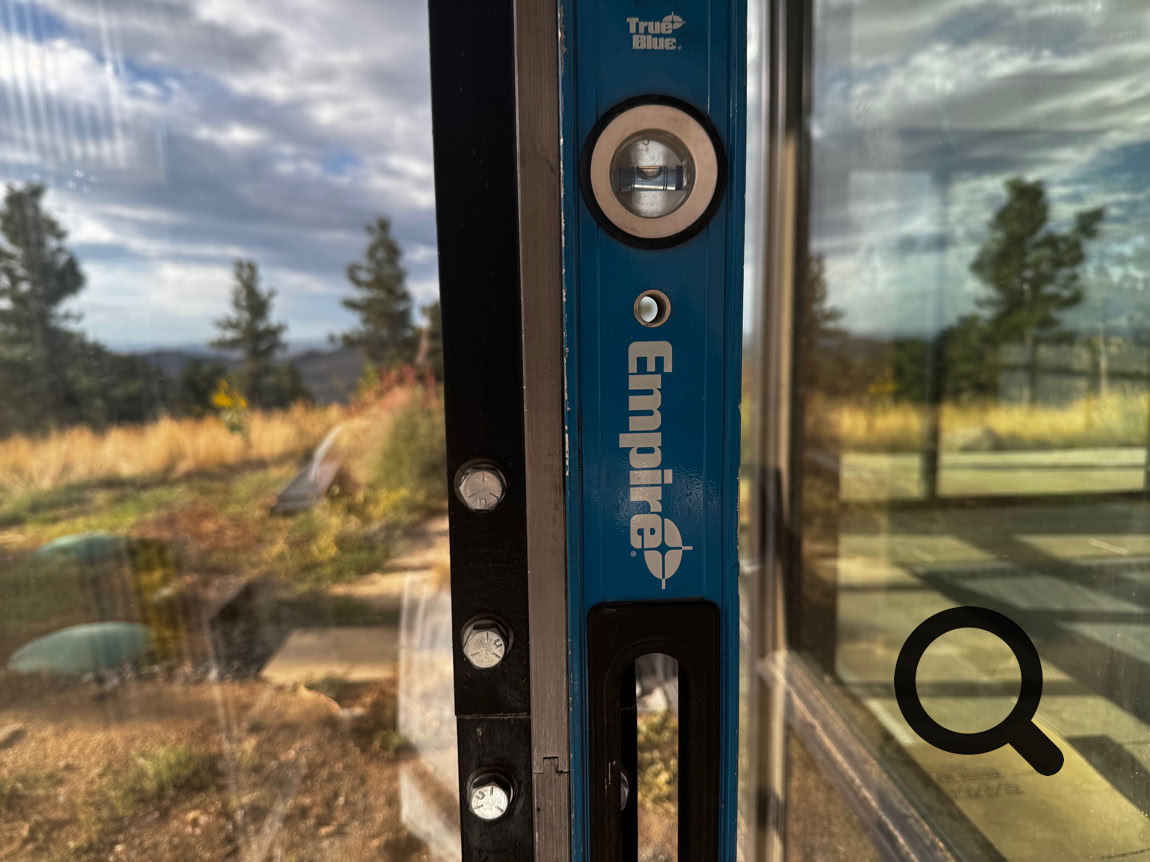 Here’s the joint between the bottom and middle pieces of rail on the south side. You can see that the bubble is perfectly centered in the level and can clearly see the tongue and grove joint between the rail sections.