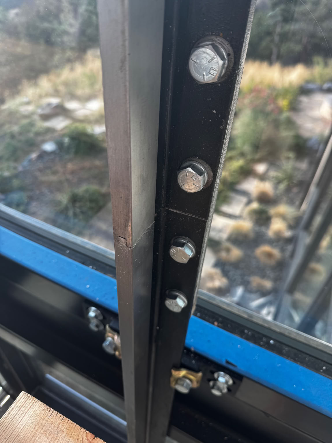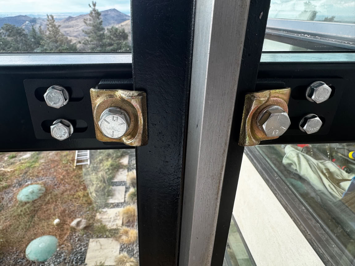 This is the joint between the middle and top rail sections on the south. This section was put up mid afternoon or so. The elevator people put the blue temporary tape on the enclosure’s steel to protect it from the drilling and tapping chips needed to fasten the track bracket to the shaft steel.