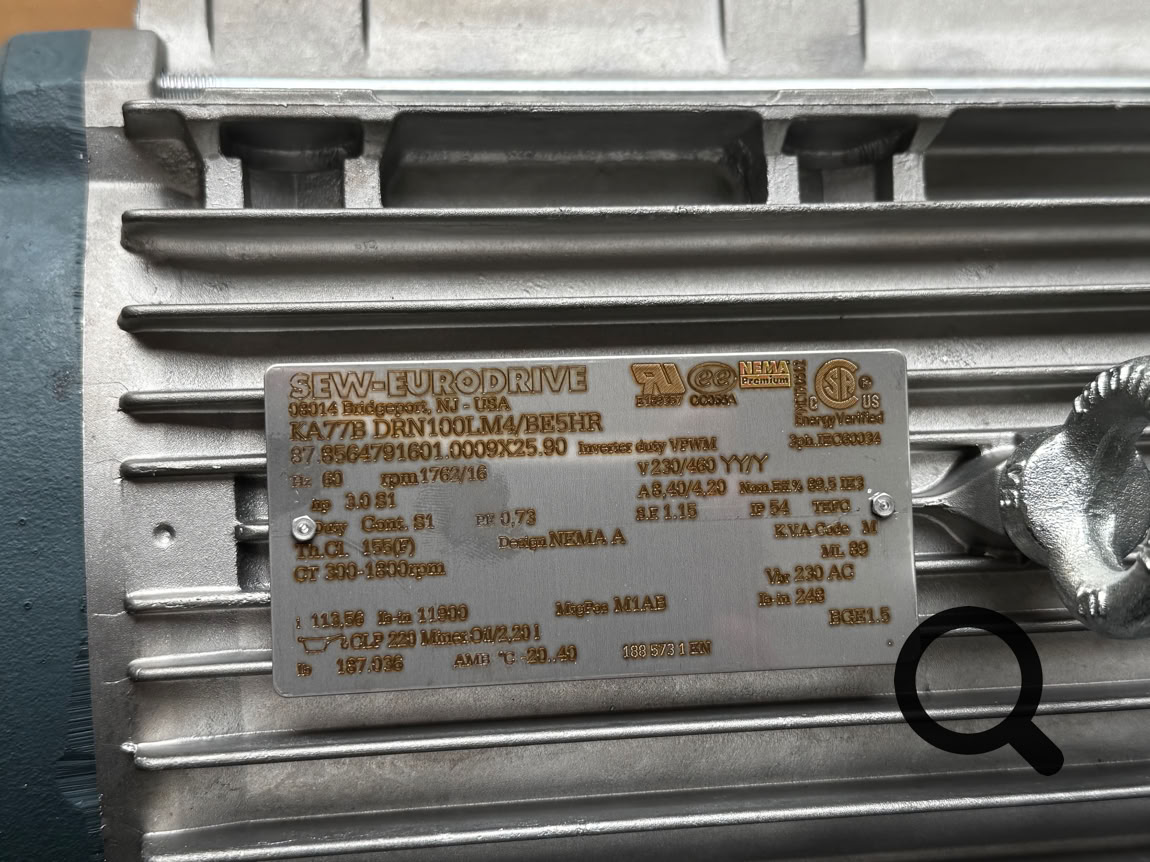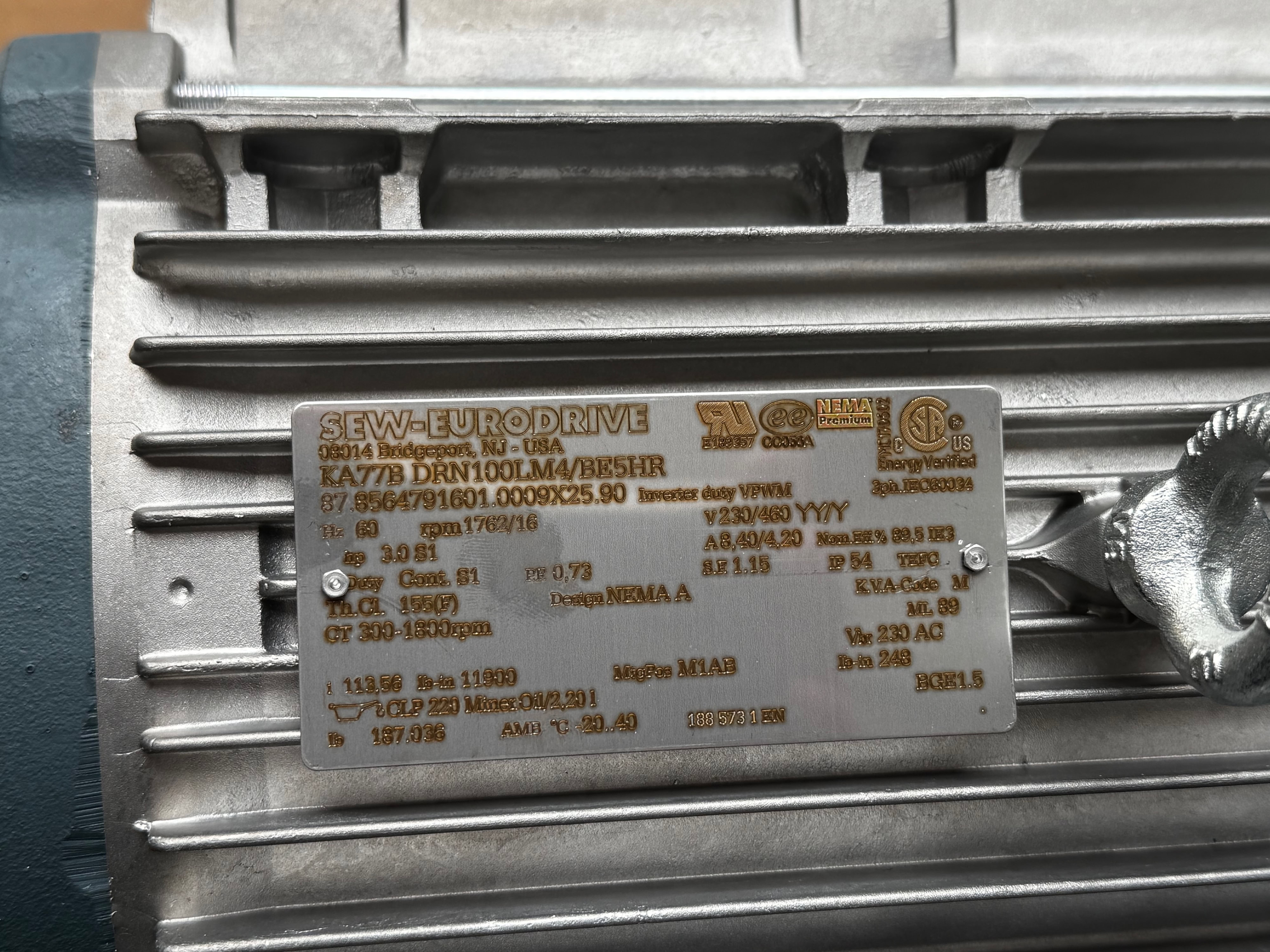 The motor model number is DRN100L M4/BESHR, the serial number of the unit is 87.8564791601.0009X25.90.