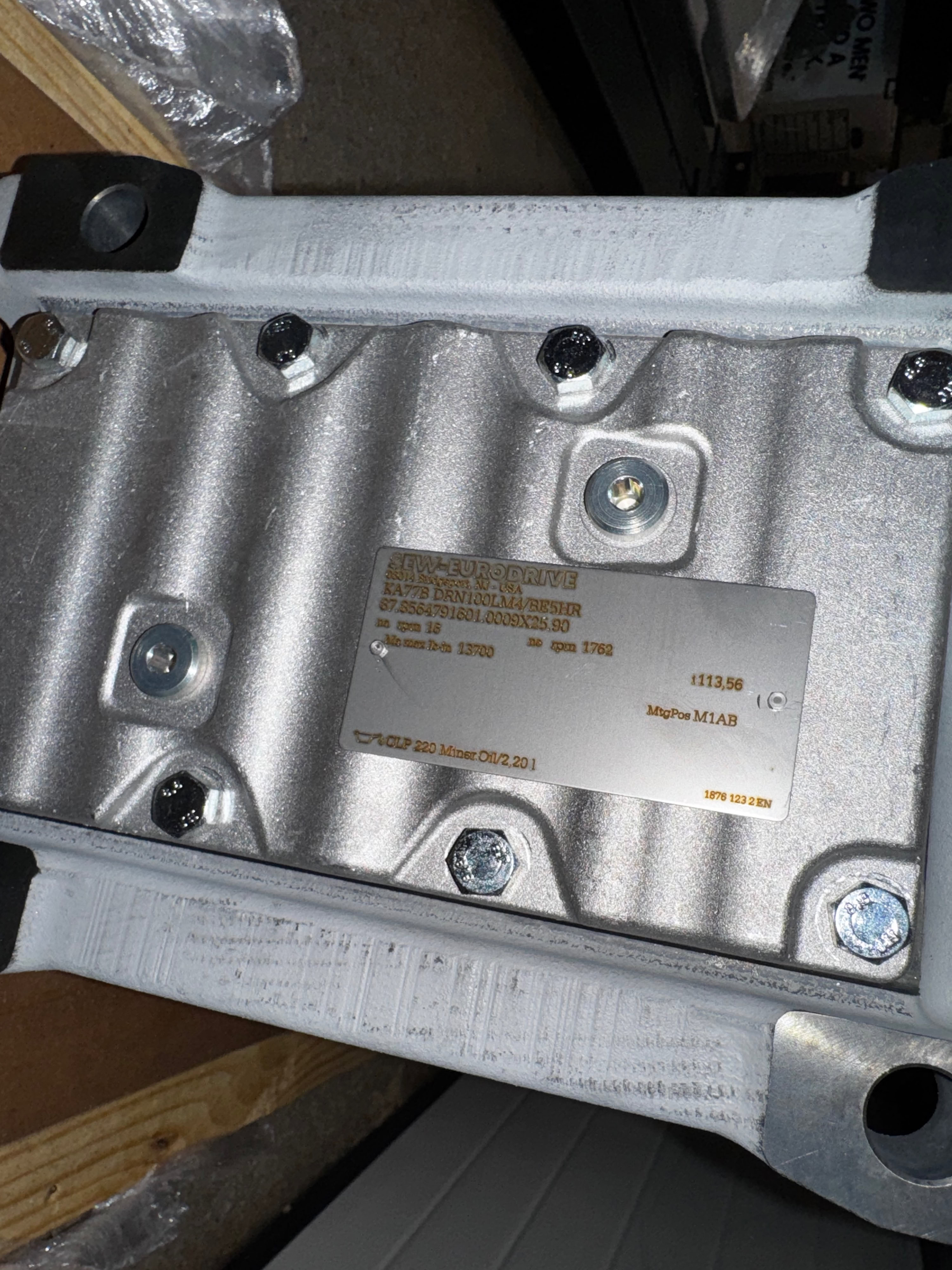 The gear box has it own nameplate, but, oddly enough has the same serial number as the motor. There are a couple more bits of data on it, this wants ISO 220 Oil, which is standard 90 weight gear lube. It also can deliver up to 13,700 inch-pounds or 1141 foot-pounds of torque.
