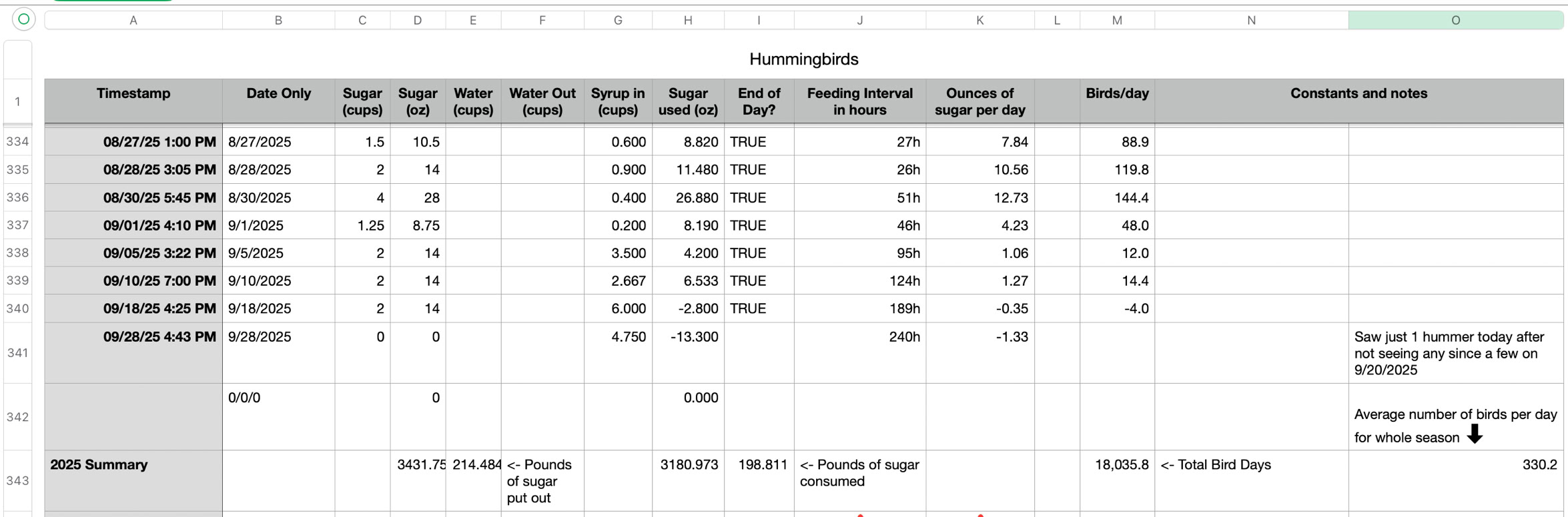 We had a lot more birds this season than last, more feeders means less crowding and happier customers. Also, hummers remember where the good flowers are and check them out more often.