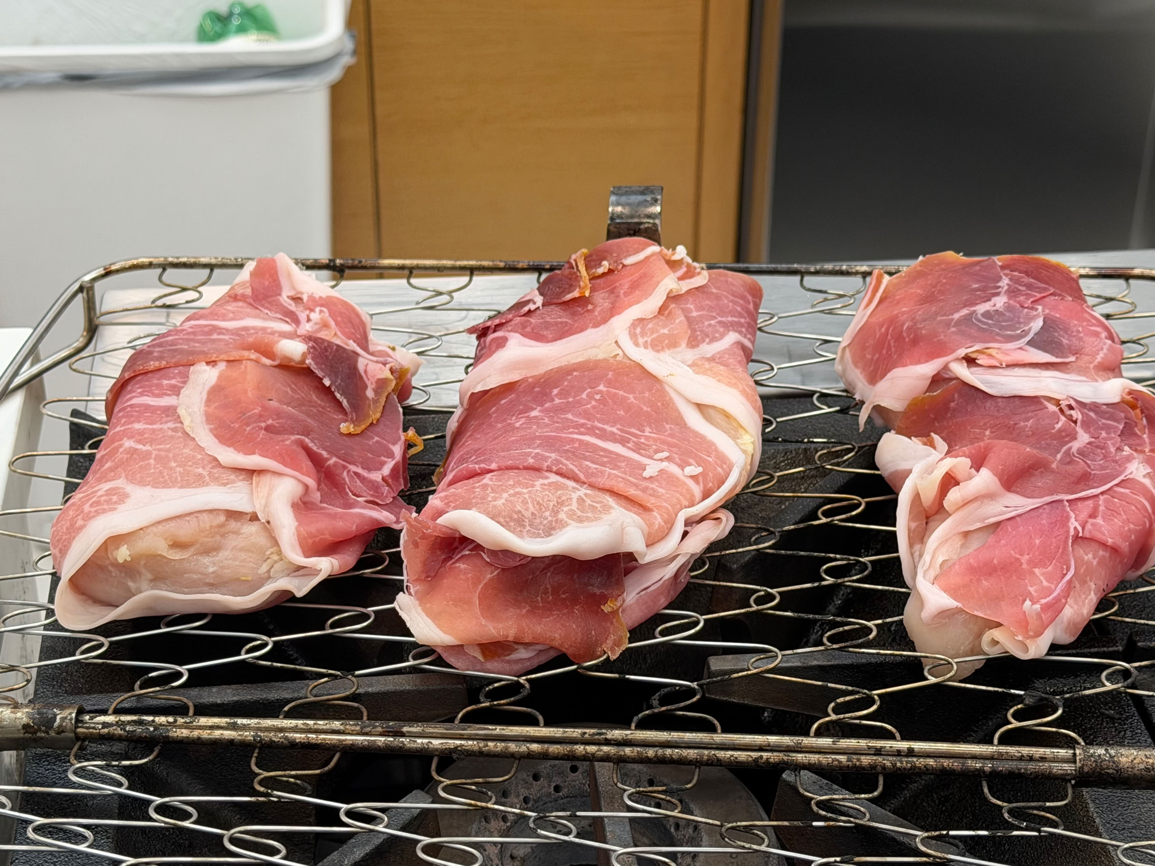 The weather forecast says that the only really grillable days this week are today and tomorrow, so we’re grilling on both of them! Today’s dinner is prosciutto wrapped, stuffed chicken breasts.