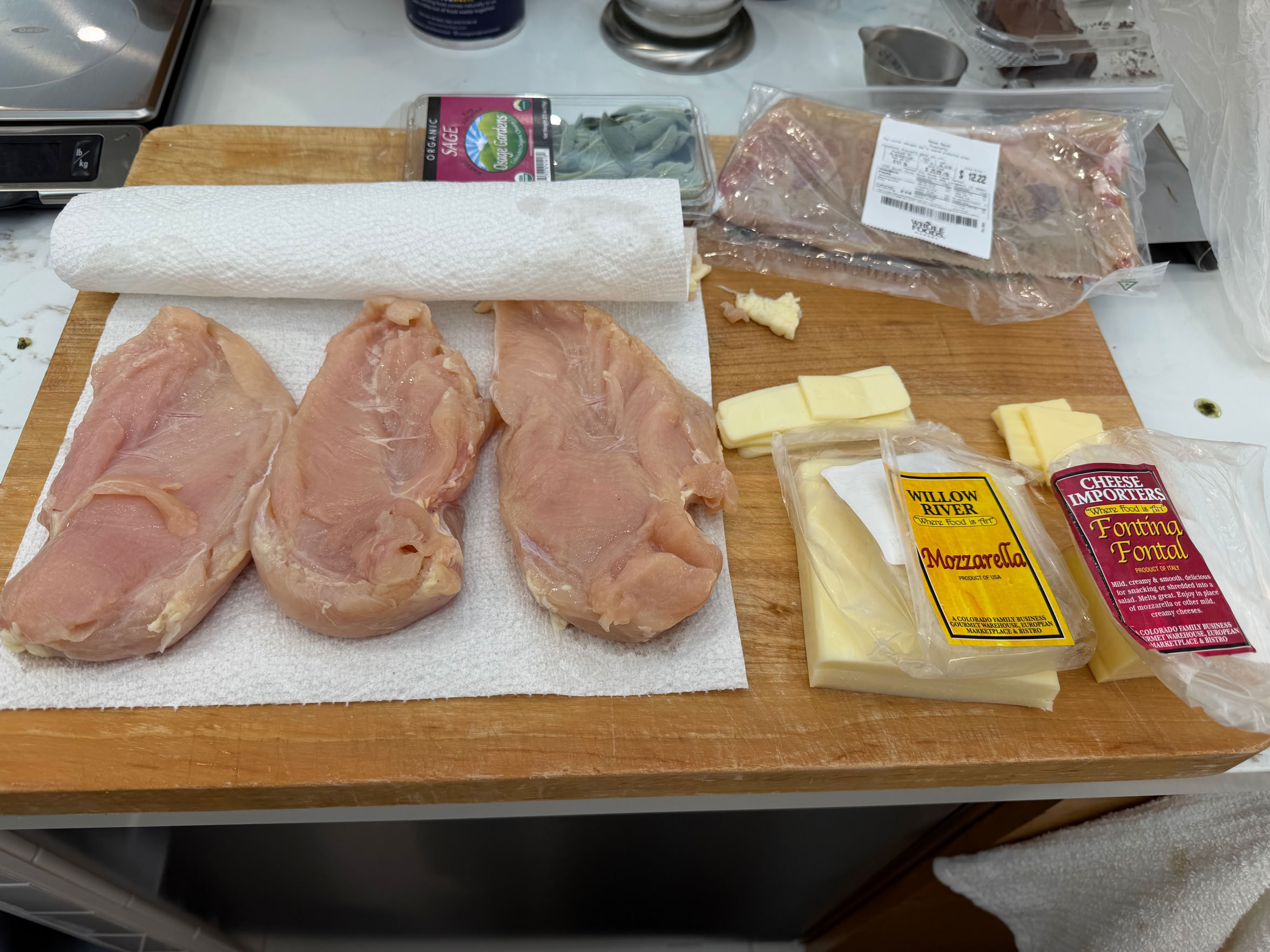 We don’t really have a recipe, per say, we just stuff as much cheese and sage as the particular breast will hold and use 2-3 slices of proscuitto per breast, depending on the size of the breasts and the proscuitto slices.