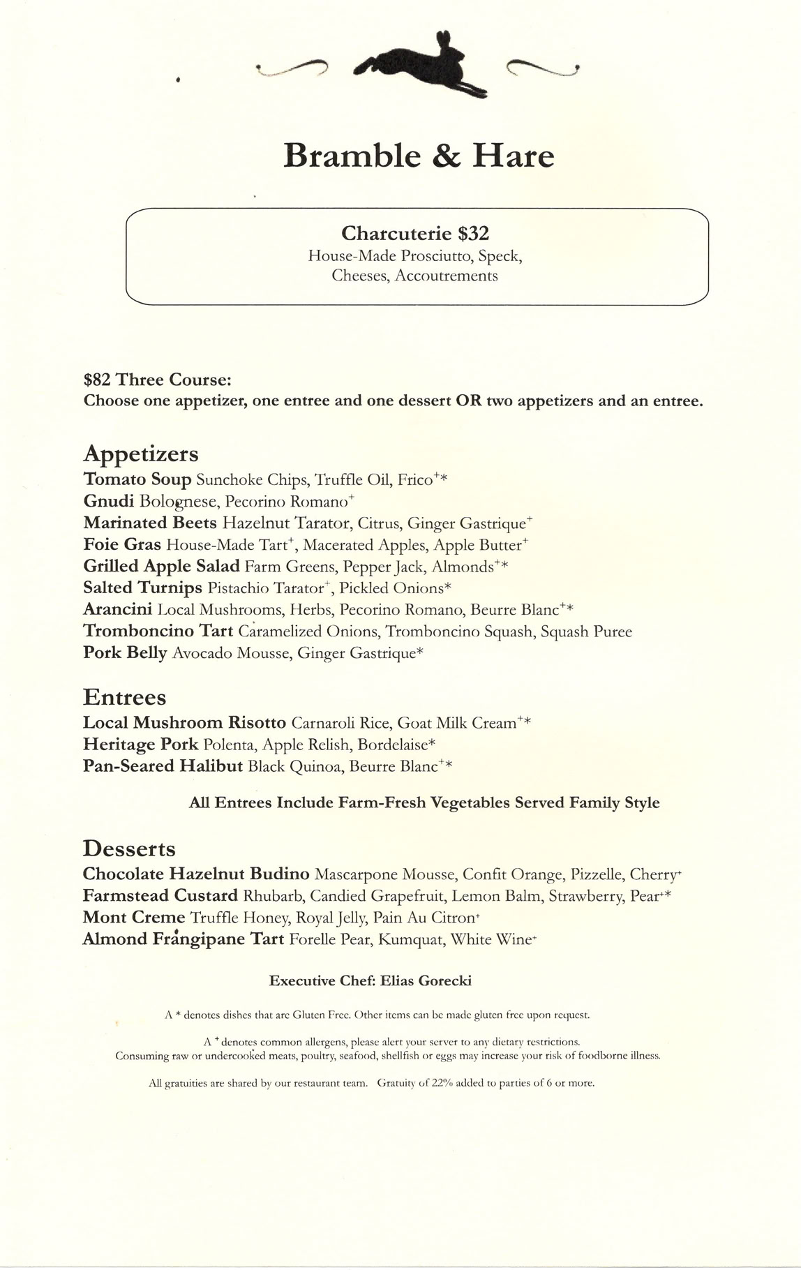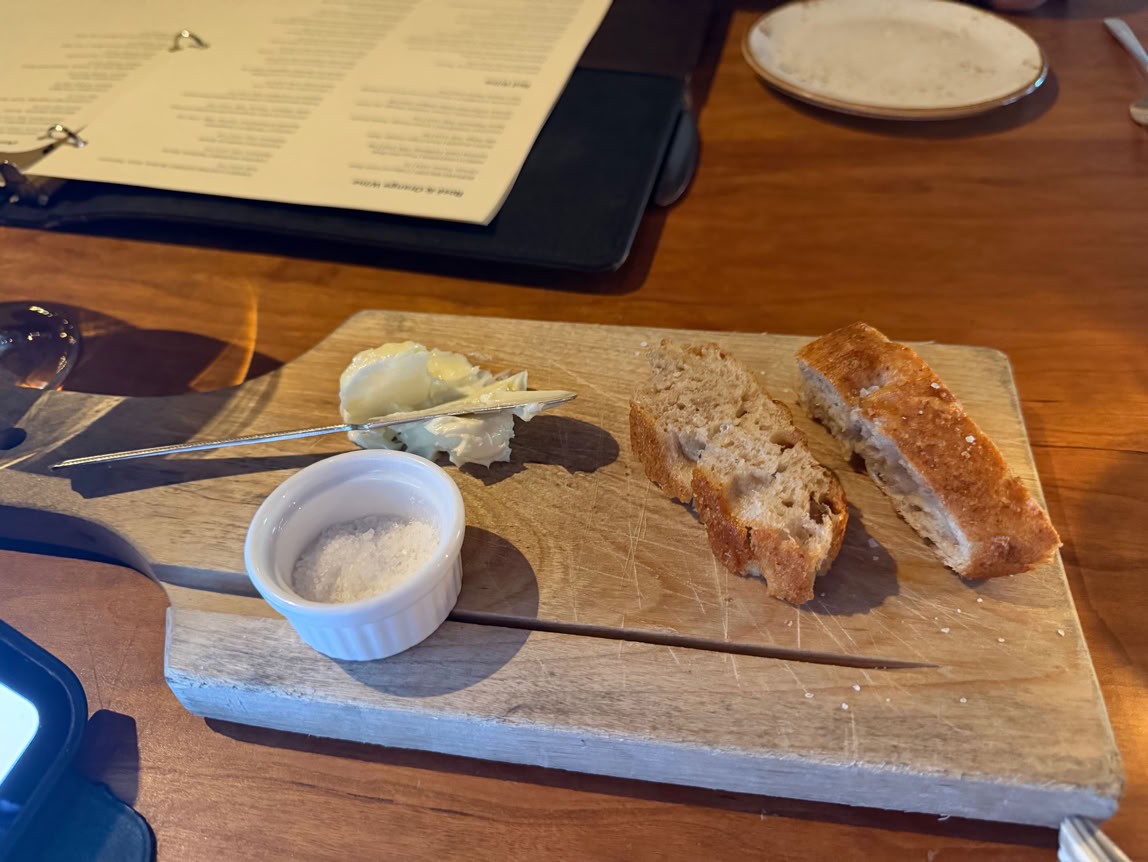 The very start of dinner, the bread plate. This time foccacio, made with grain from the farm with butter and salt. Good thing they do good portion control, or this would have been the whole meal. Wow!, it was Good!