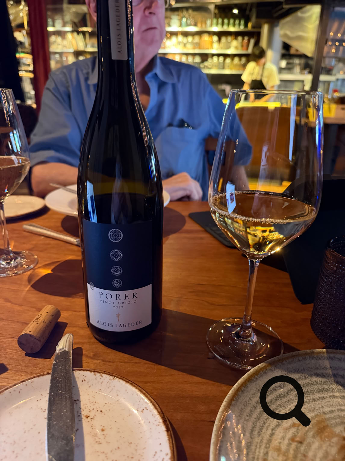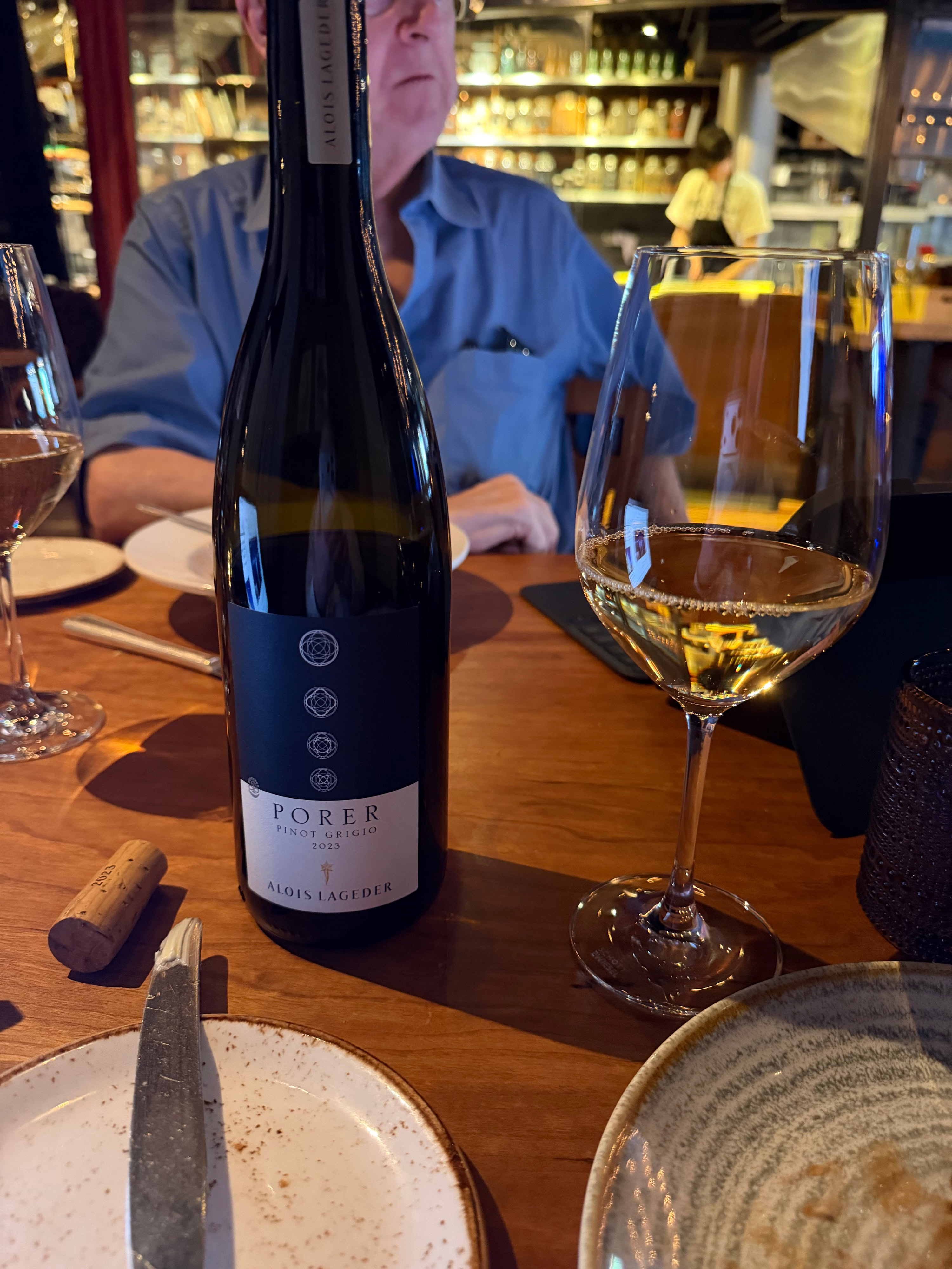 Tonight’s wine is a Pinot Grigio from Alois Lageder. They use animals to maintain the vineyard. Martin got some pineapple and other tropical fruits on the nose, very bright with good acid.