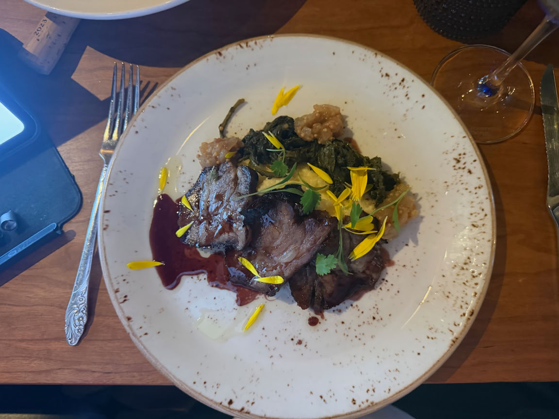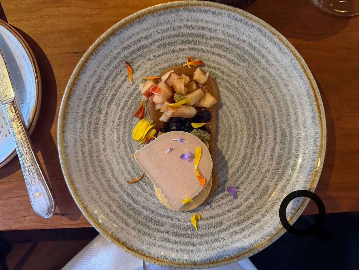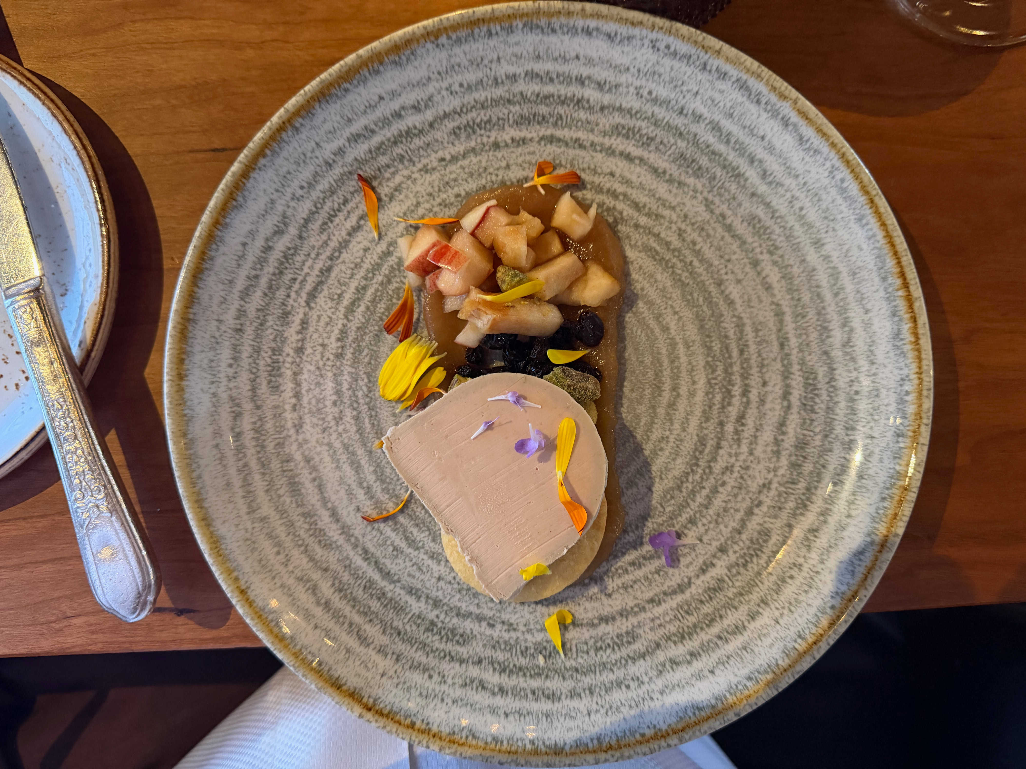 Martin’s Foie Gras, sitting on a biscuit made from their own grain, with the macerated Apples and Apple Butter. The tart apples complemented the super rich foie gras perfectly. Edible flowers topped the dish.