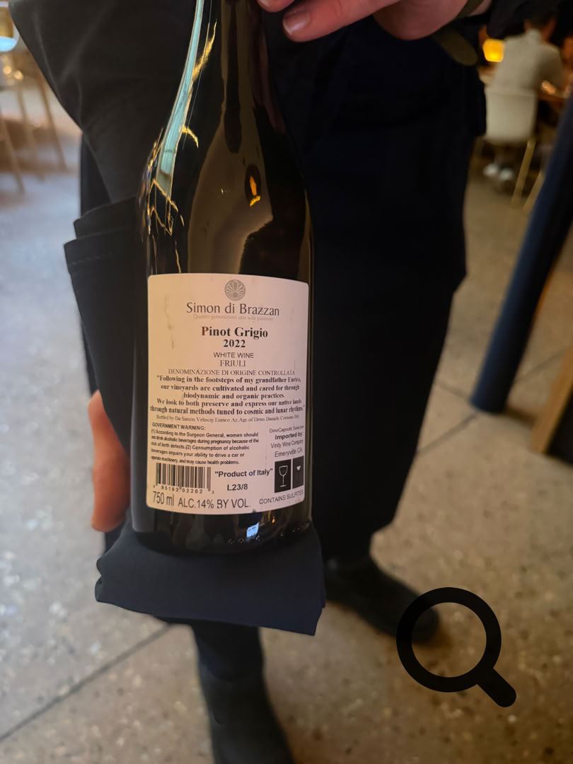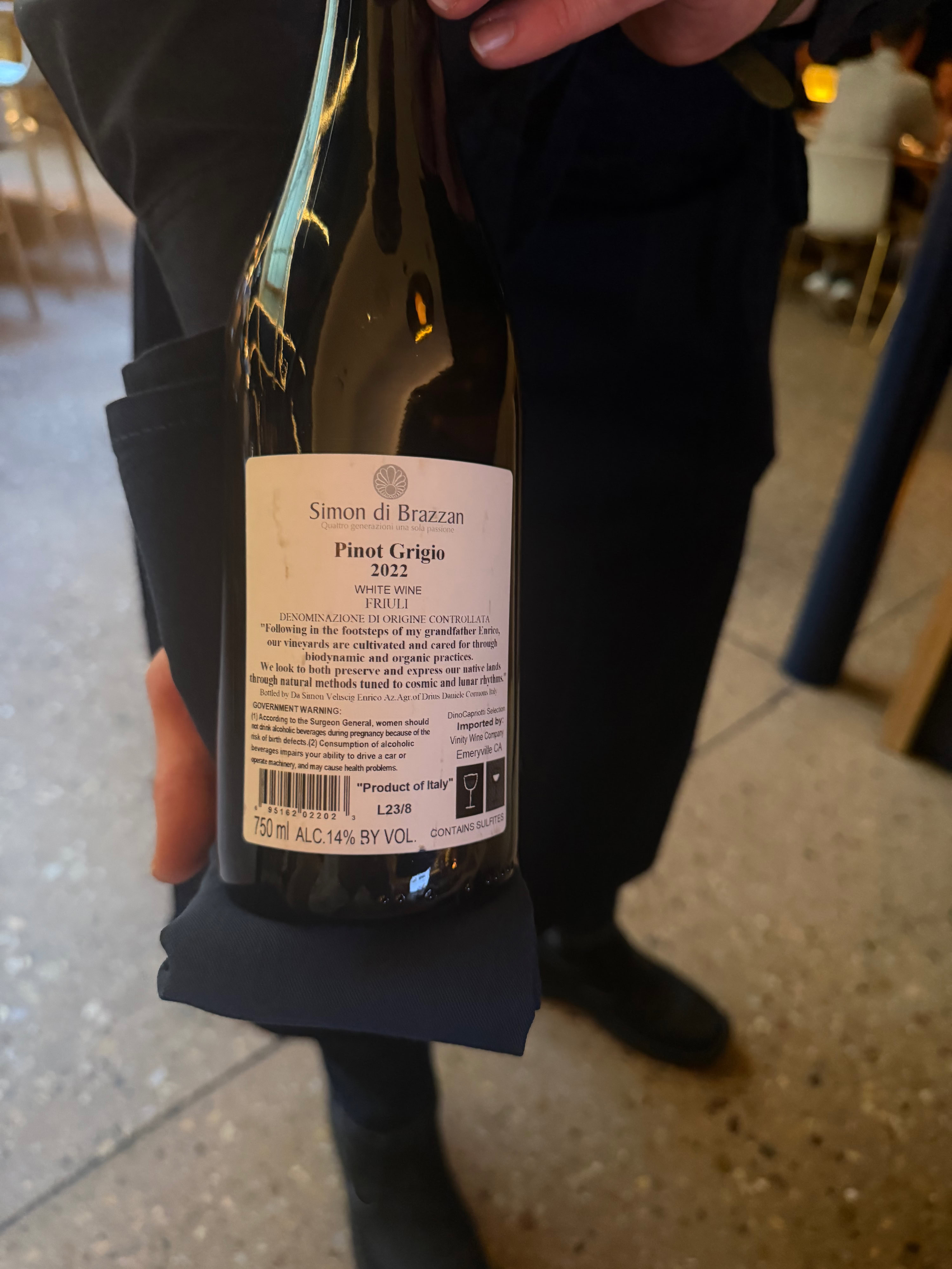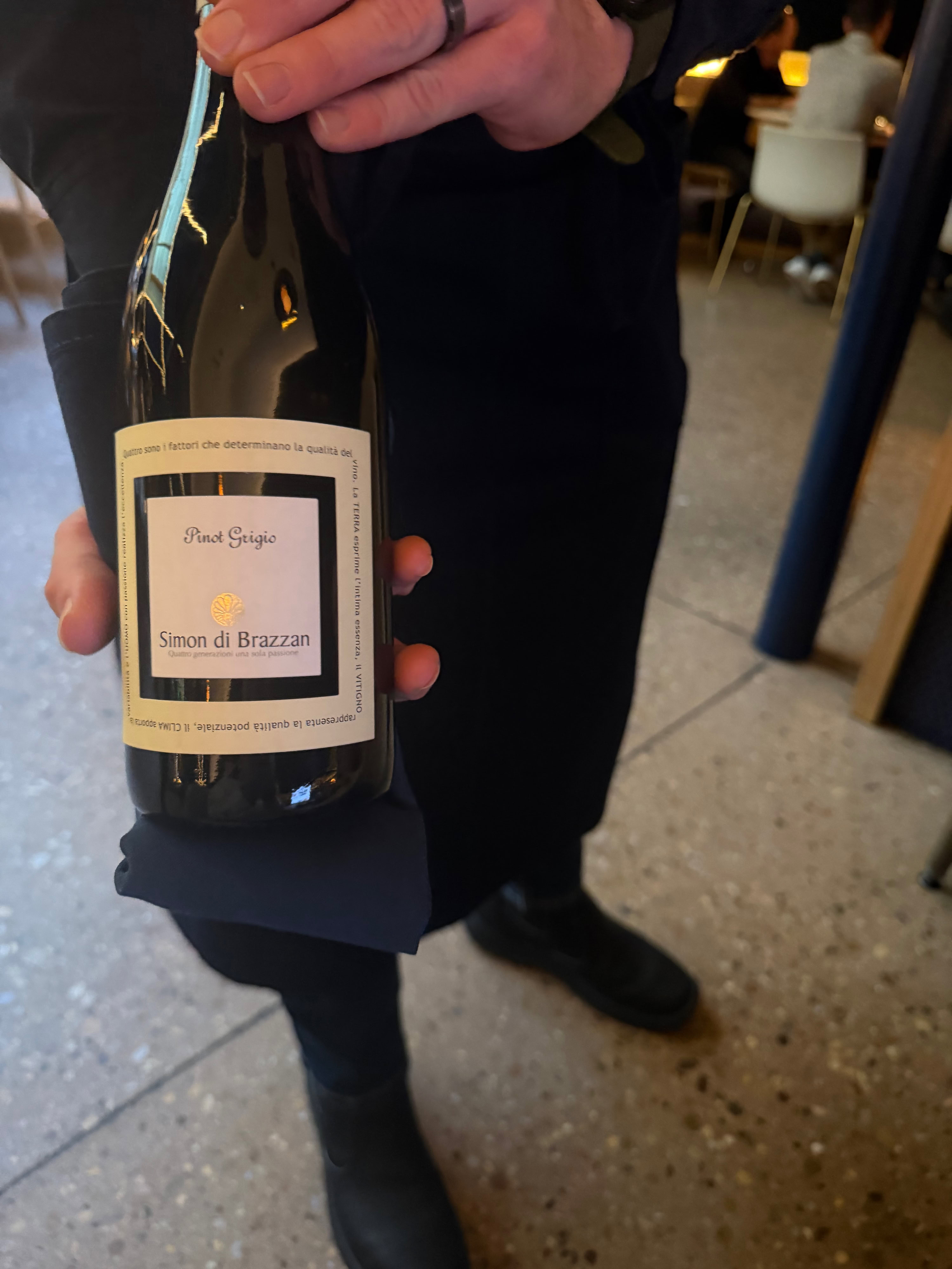 The wine is from Simon de Brazzan, in Friuli, Italy. Martin got citrus on the nose, Bill thinks its tangerine. Really nice with our lamb mains.