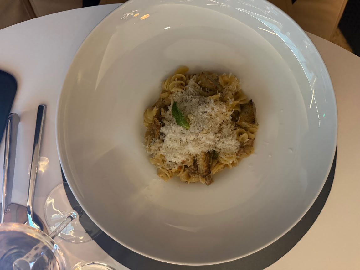 This is Bill’s main course, Fusilloni Al Ragu D’Agneillo. The dish has a substantial amount of pecorino shaved over it and of course the lamb is front and center. This ragu is a mild but flavorful and savory ragu.