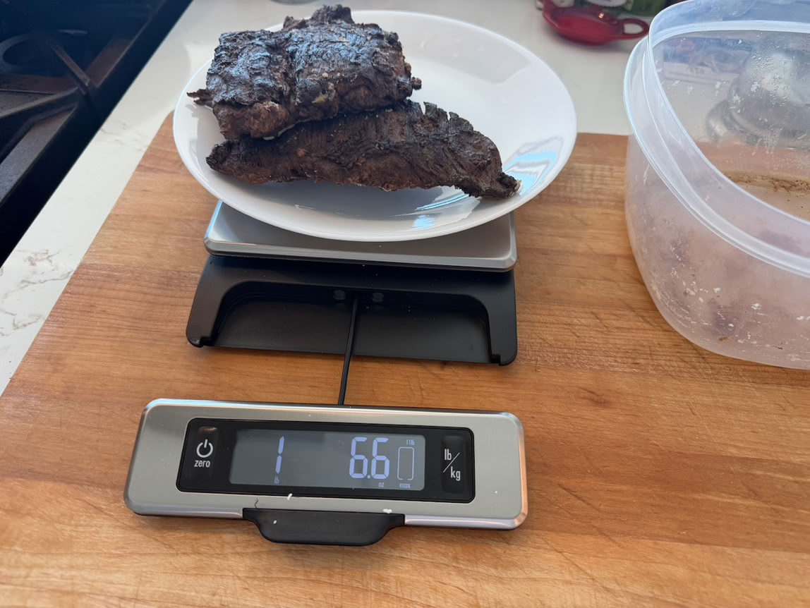 We’ve got one pound 6.6 ounces or 22 ounces left after two rounds of fajitas. We make a lot of beef so we can use up the whole bottle of Claude’s.