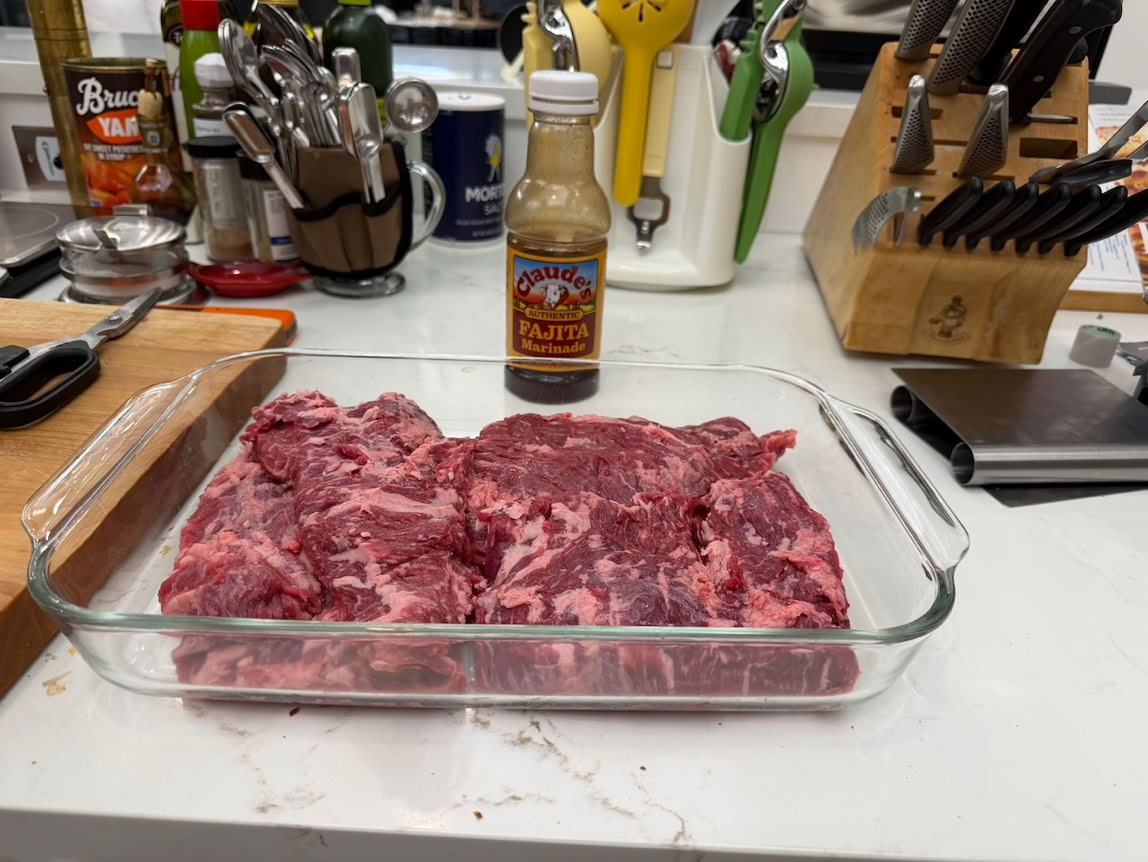 This is it, the entire “prep” for the beef in the fajitas is to marinade the beef in Claude’s Fajita Marinade for a couple of hours.