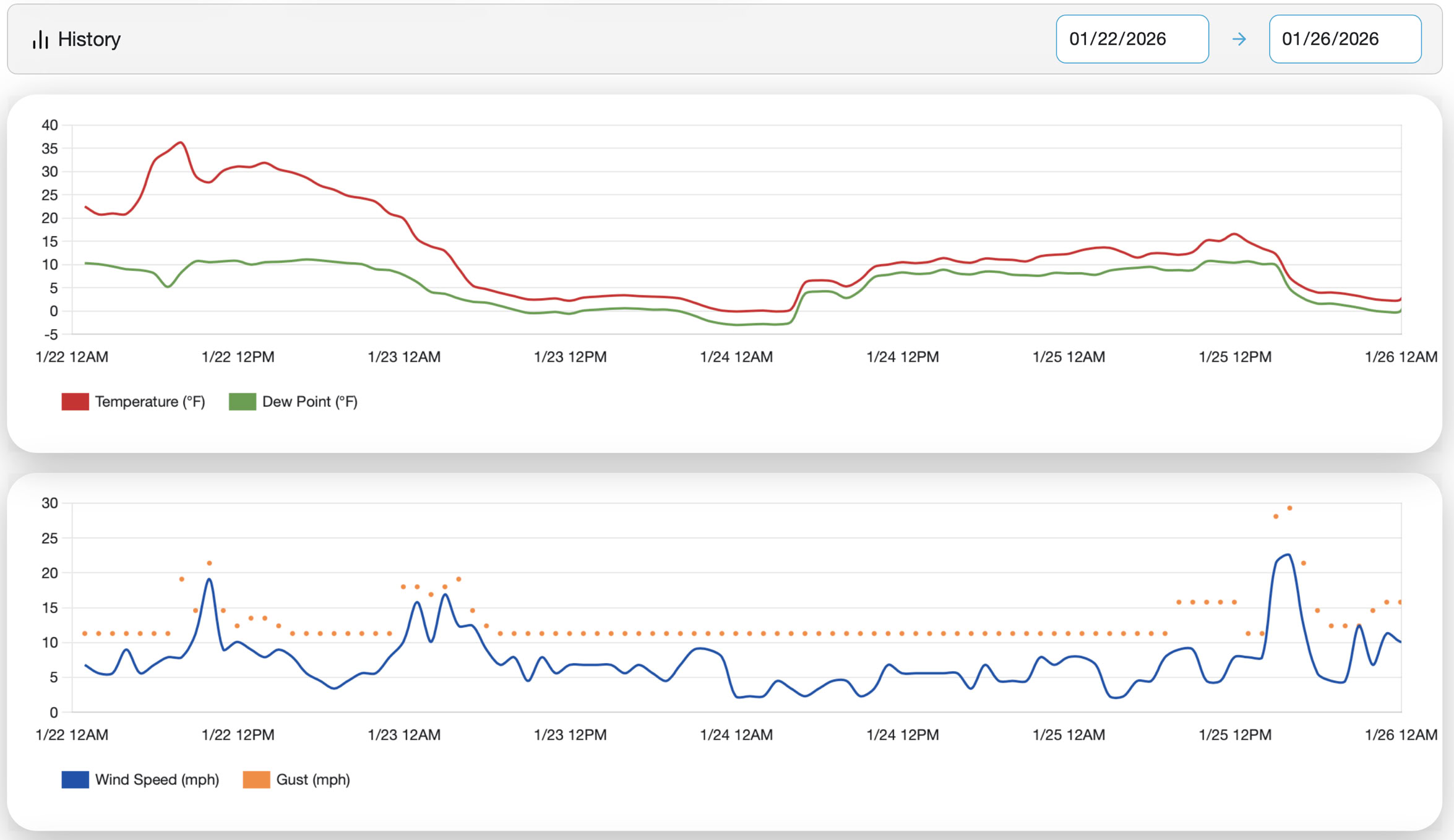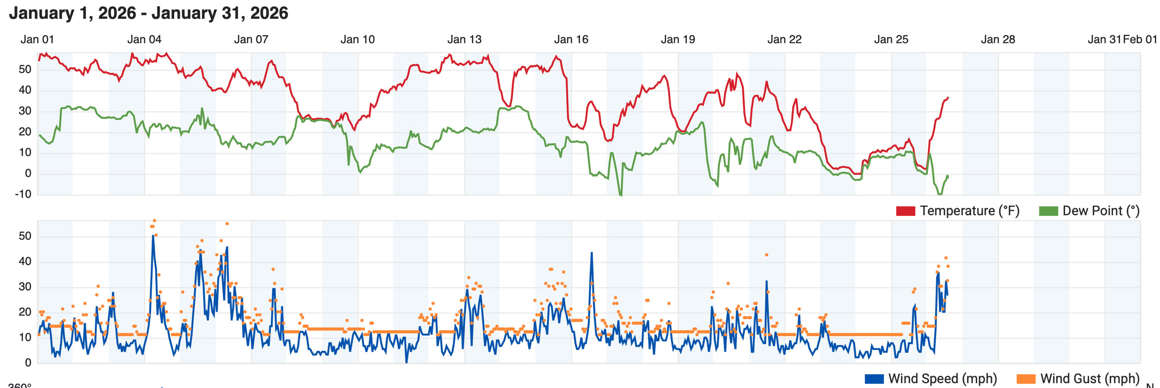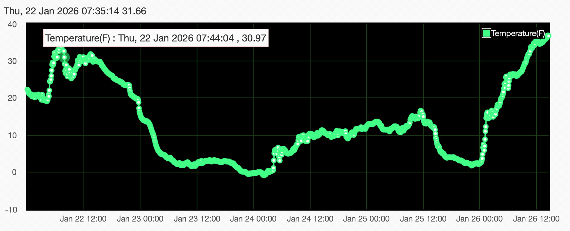 That was quite a cold spell! We went below freezing at 8:00 AM, Thursday January 22, 2026 and stayed there until 11:30, Monday January 26, 2026. 4 days without a high! Heh, remember we’ve got standards up here. If water won’t melt we don’t have an actual high, just an upper low.