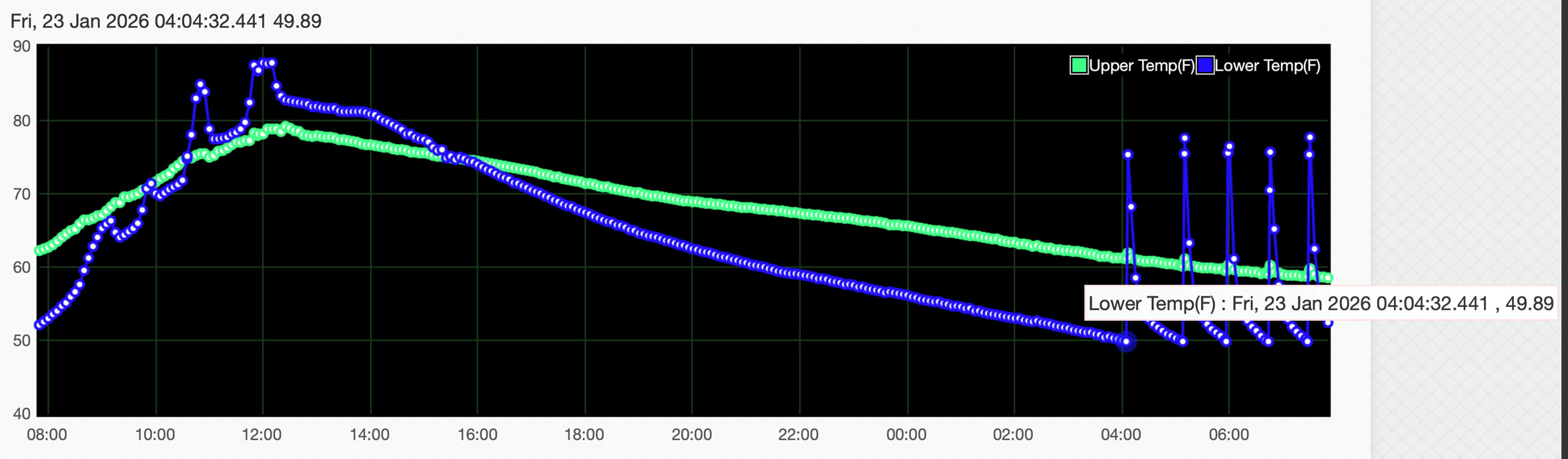 This is from the (as yet undocumented here) X-410 Elevator shaft HVAC controller. There is a temperature sensor at the top and bottom of the elevator shaft. Currently, if the lower sensor goes below 55 °F, the X-410 turns on the 4kW shaft heater and holds it on until the lower sensor hits 75 °F and you can see it has to work a little at these temperatures!