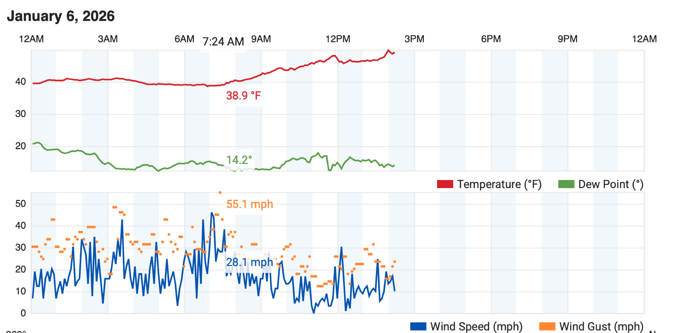 Numerous gusts over 40 yesterday and today, with 55.1 at 7:24 this morning. That’s way too much excitement!