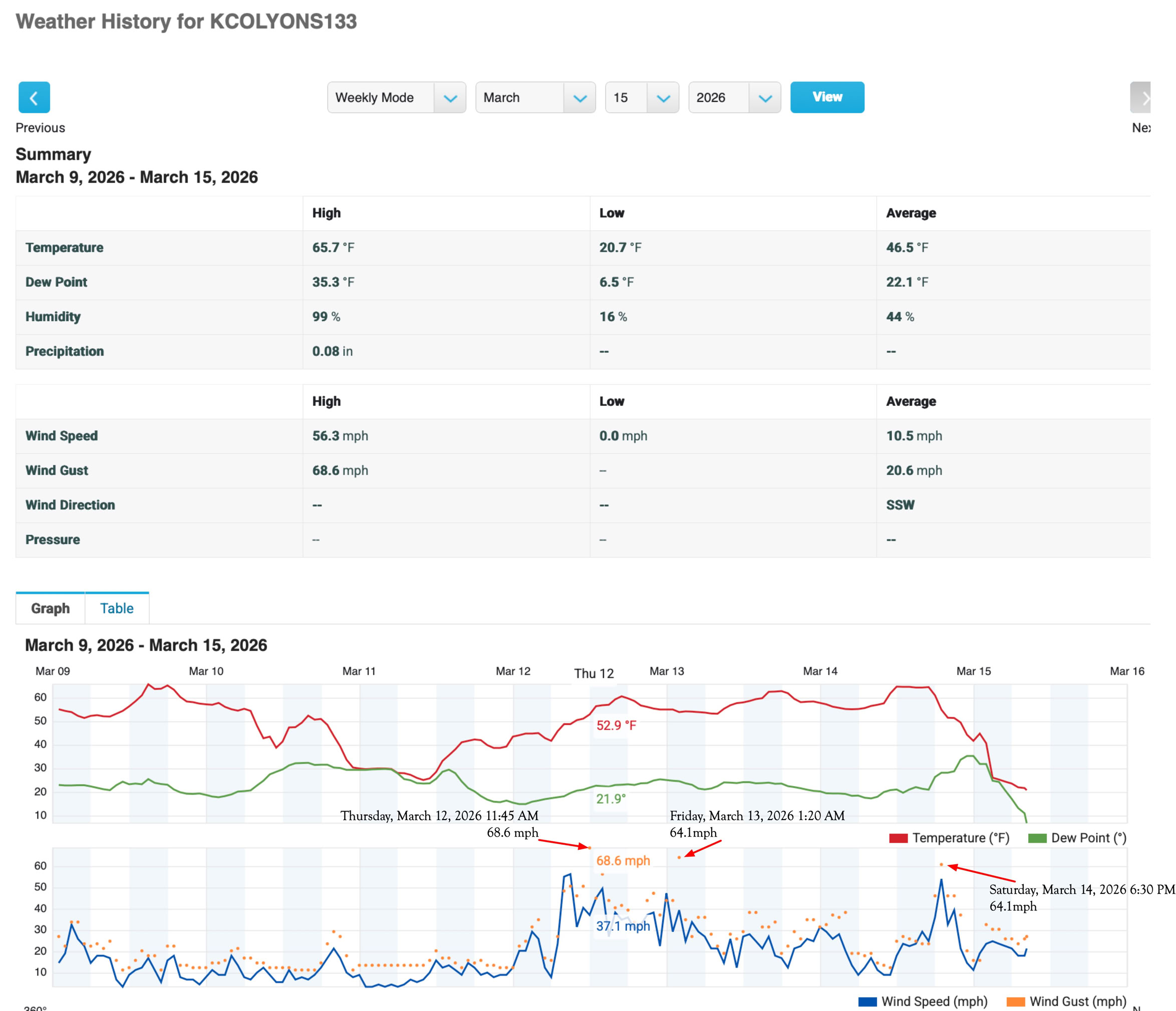 Thursday, March 12 in the morning we had about an hour of wind constantly over 50 mph, then Thursday, Friday and Saturday each had a gust over 60 mph. Pretty 3 days of howling winds, that is enough!!