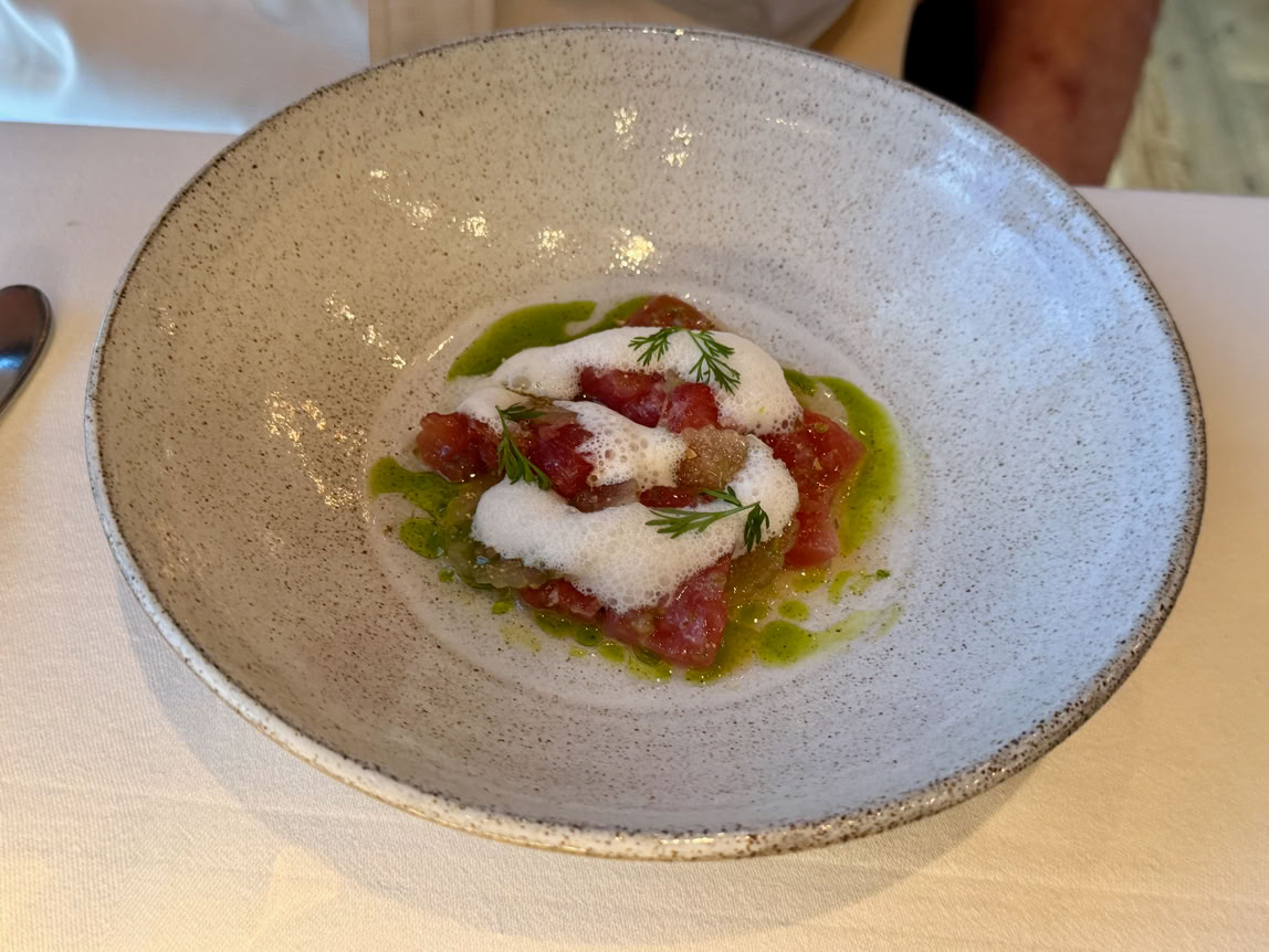 Bill’s Tonno, Bluefin Tuna, d’anjou pear, finger lime, and a bit of horse radish. It is almost impossible to get Bluefin tuna, it is quite simply the best sushi tuna there is and the Japanese get almost all of the small amount caught. This was paired with an Edi Kante Malvasia 2022.