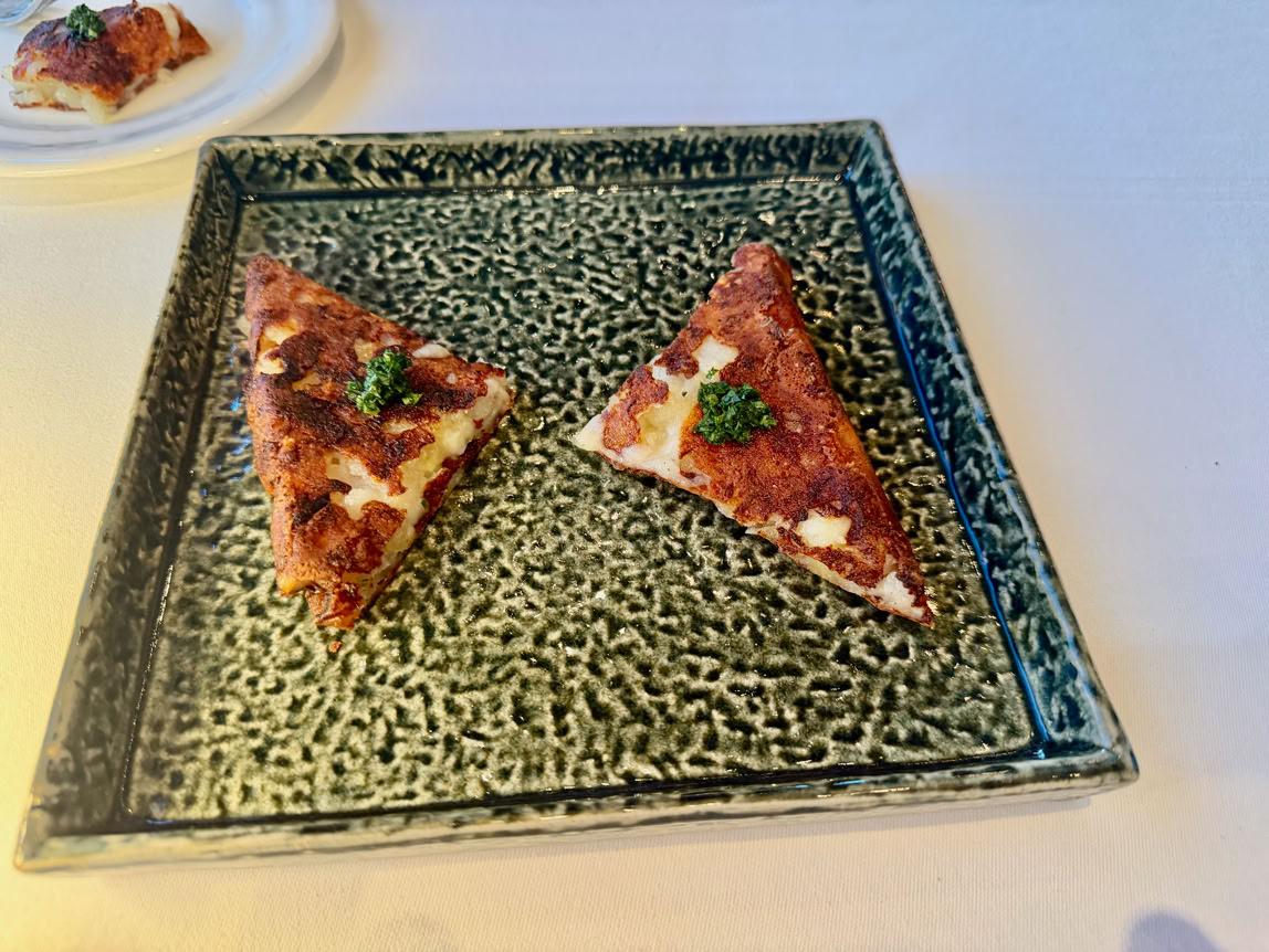 The amuse-bouch was buckwheat crisps in a Montasio cheese fondu. Actually more of a whipped Montasio cheese sauce, it wasn’t hot and then dusted with porcini mushroom dust. Wow! I wish we could have ordered this as a course.