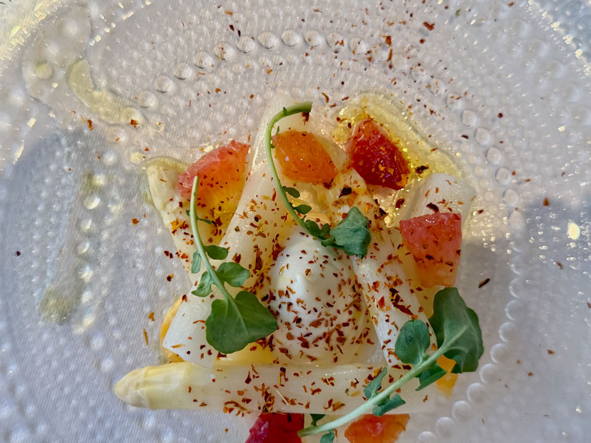 Martins Asparagi Bianchi, some sort of cheese “sauce” with alp blossoms, citrus, watercress and a honey vinegar dressing. This was good, but Bill definitely won with the tuna. This was paired with a Veyder-Malberg 2023 Grüner Veltliner which really worked. Everything worked together, I wouldn’t have thought honey and citrus, but it was really good.