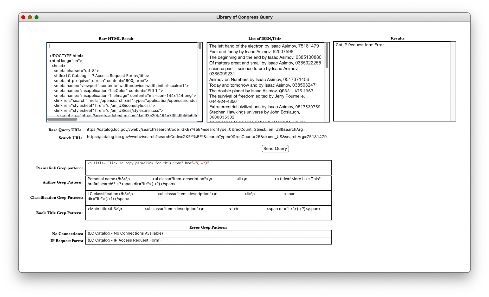 Above is a screenshot of the single card LiveCode stack. By keeping all the greps and URLs in text fields, we can follow any changes the Library of Congress makes to their web site without making any code changes. What this stack is doing is called “Screen Scraping” because we’re grepping the returned HTML that a browser would display instead of using an API (application program interface) that the LOC provides as an extremely expensive subscription service. Even if we did subscribe, we’d still have to write code to handle its results.