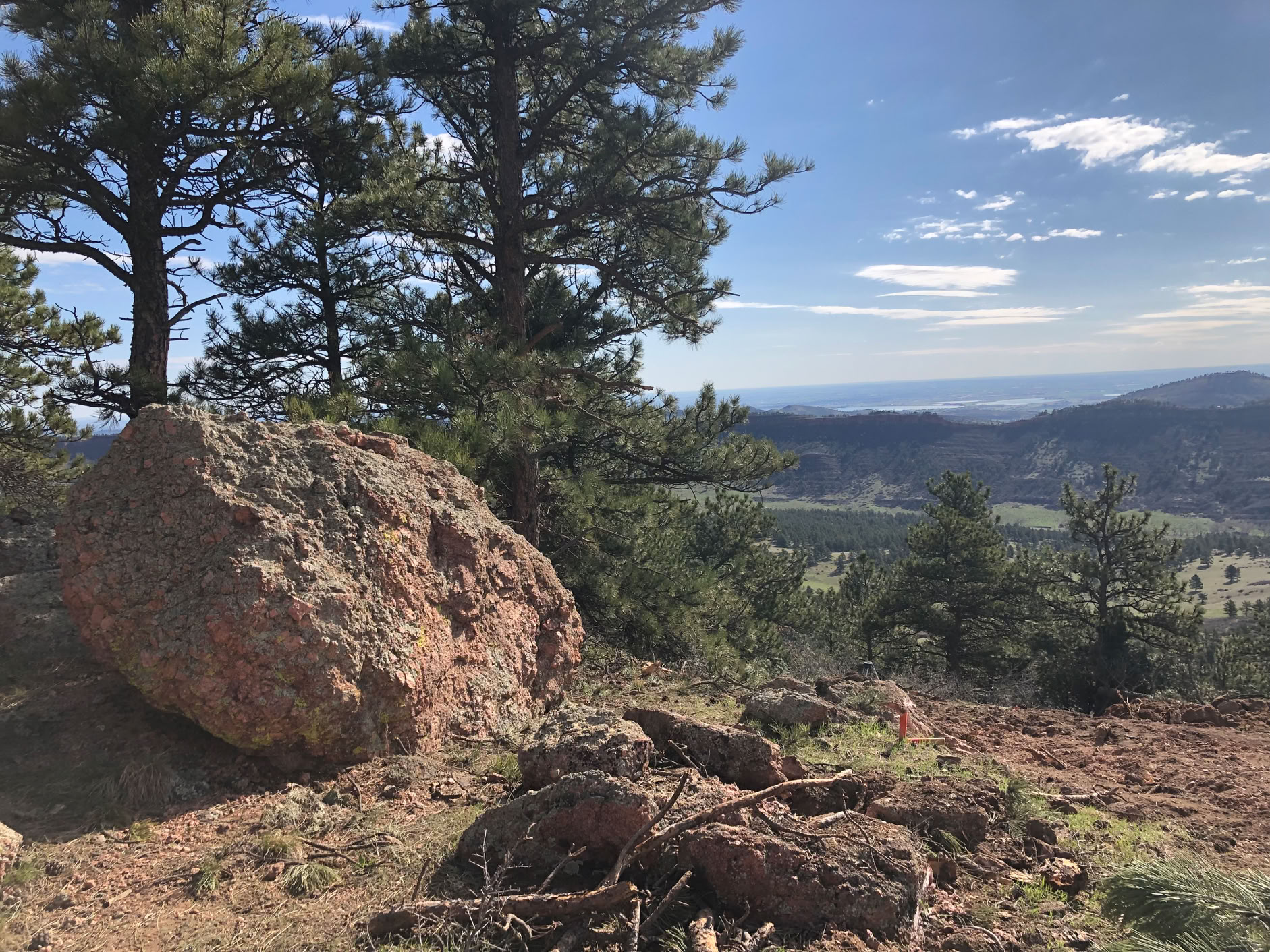 Enough of the trees are down so that we can evaluate the views! Wow! They’re even better than we’d hoped for! When the topographic maps say that the site is at least 300’ above the hogback to the east, it’s difficult to really get a feel for what that means, when all you can see thru the trees is a few scattered glimpses of the hogback itself and even fewer bits of the eastern plains could be seen.