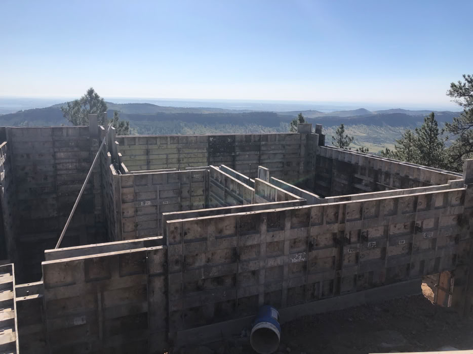 A look inside one of the forms. There’s a lot of steel in there! That’s all number 5 rebar. The vertical rebar is tied to the “Ls” that were placed into the footers. The straps that hold the forms together at exactly 8” also hold the horizontal rebar at the spacing called for by the structural engineer.