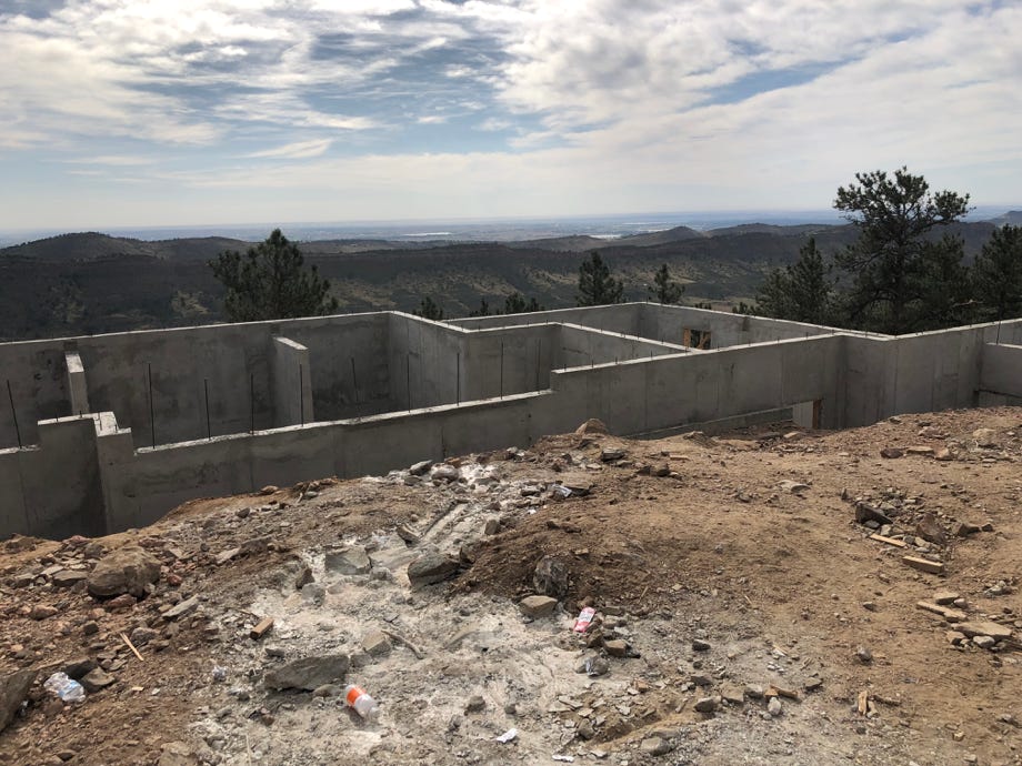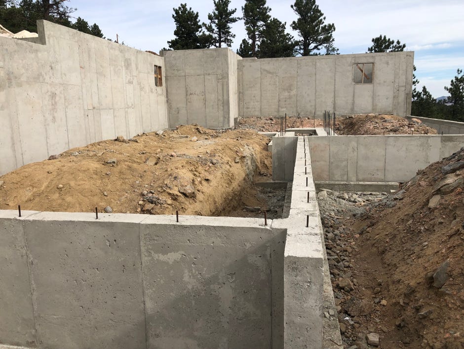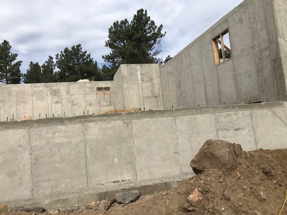 The garage, at the north end of the house. You can see the single wide door at the left and most of the double wide door on the right. The garage slab’s design hasn’t been decided on yet! The amount of fill required is enormous and would put a lot of stress on that east wall. The structural elements circled in red are called counterforts. They add strength to a section of wall and even with them, 15’ of normal fill is a lot of stress!
