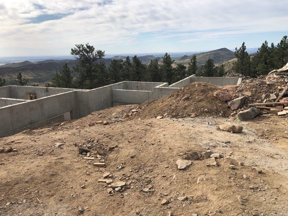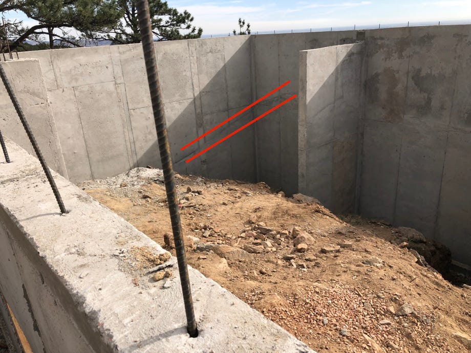 These two shots give you an idea of the amount of fill required. The left one is the overall garage, the right one is a shot to the bottom of the east wall. Fifteen feet is a lot of wall! Additionally, in the left shot, I’ve highlighted, between the two red lines, a possible problem called a “cold joint” This happens when there is too much time between the 1st pour that formed the bottom of the wall and the 2nd pour that formed the top of the wall. This potential weakness will need to be carefully inspected by the structural engineer before the final design of the garage slab can be done.