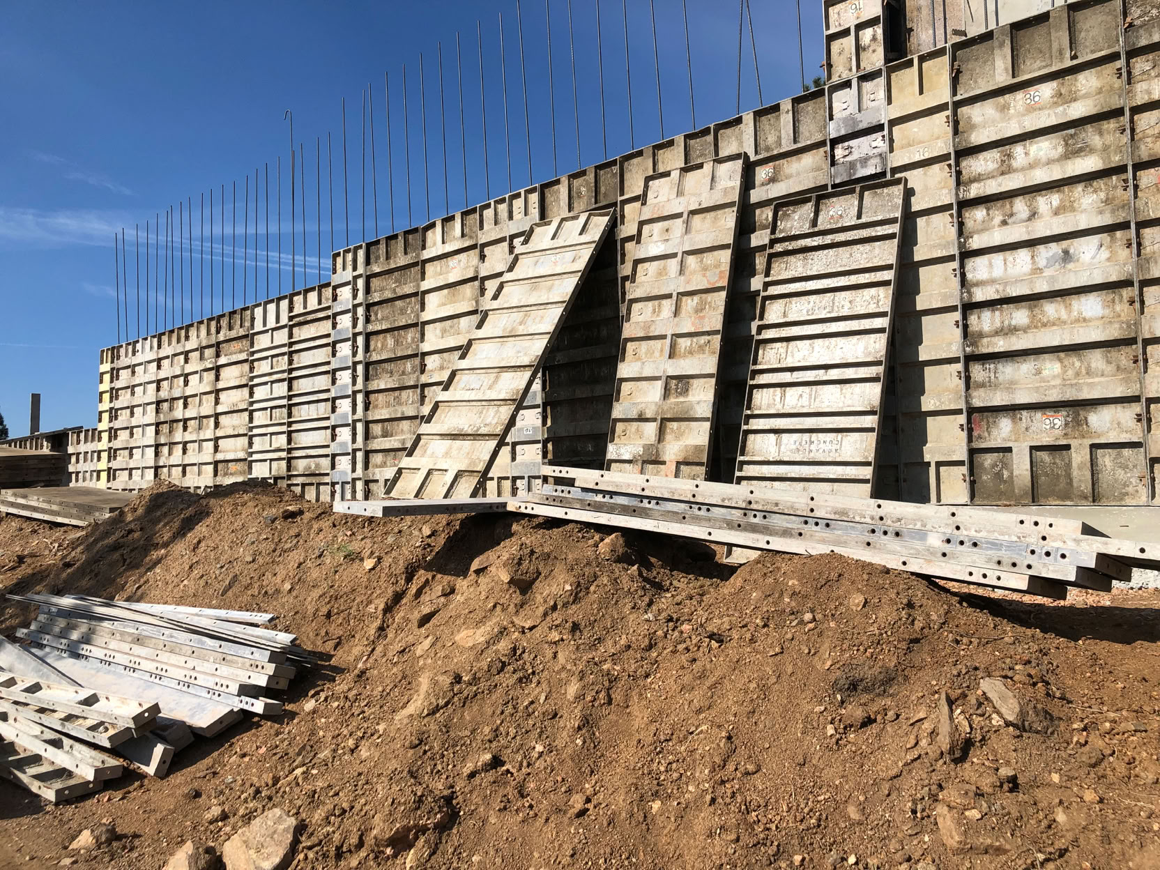 The forms for the concrete walls are starting to be put up. The walls will be 8” thick and have a rebar mesh in them. These forms are aluminum and very, very thick so that they can take the weight of the wet concrete.