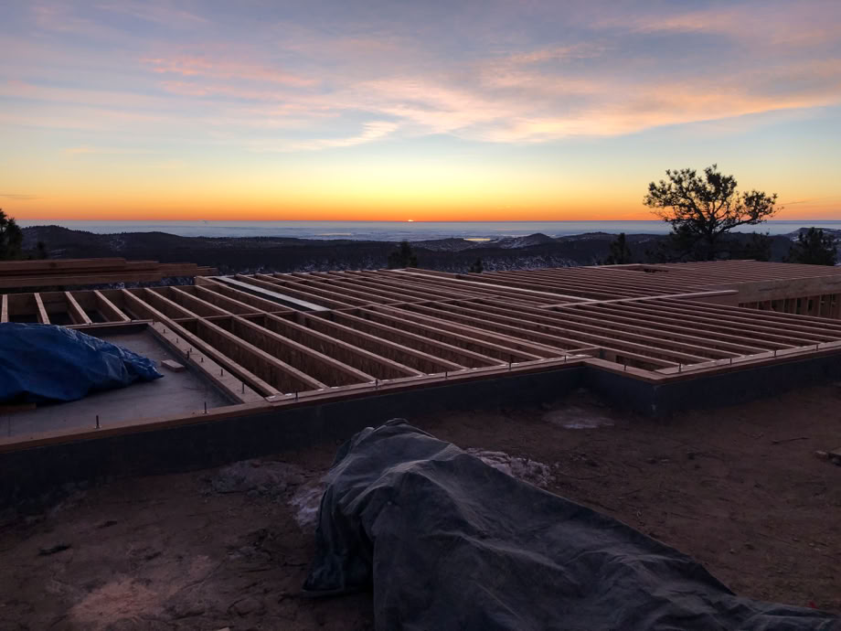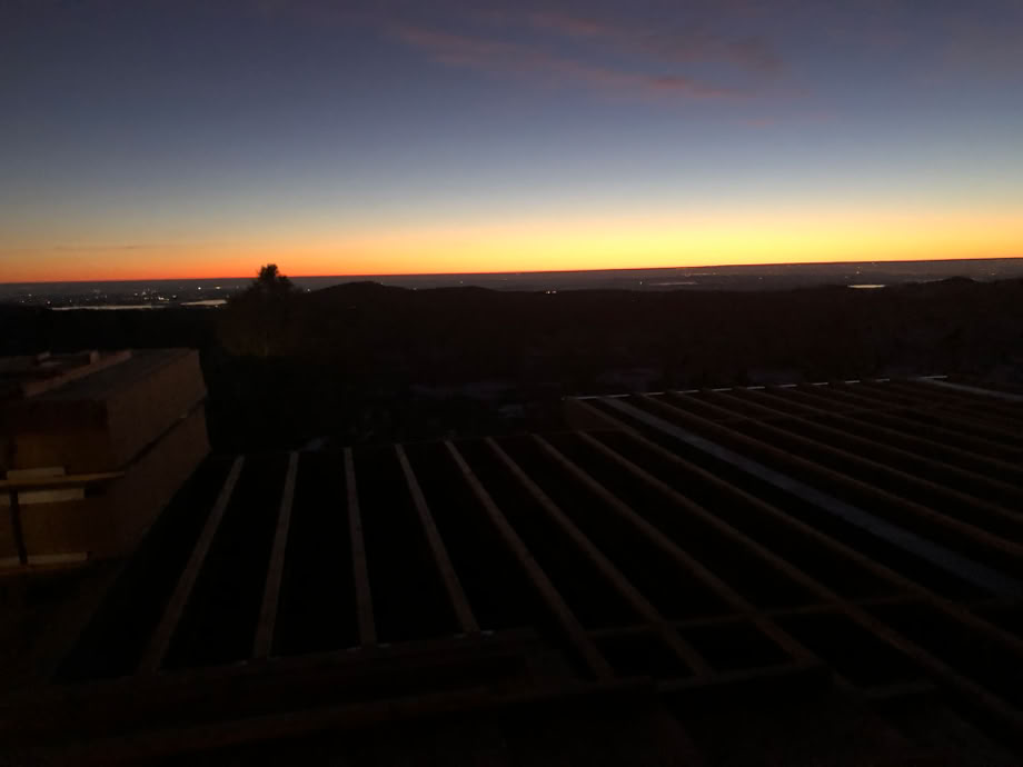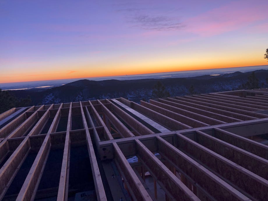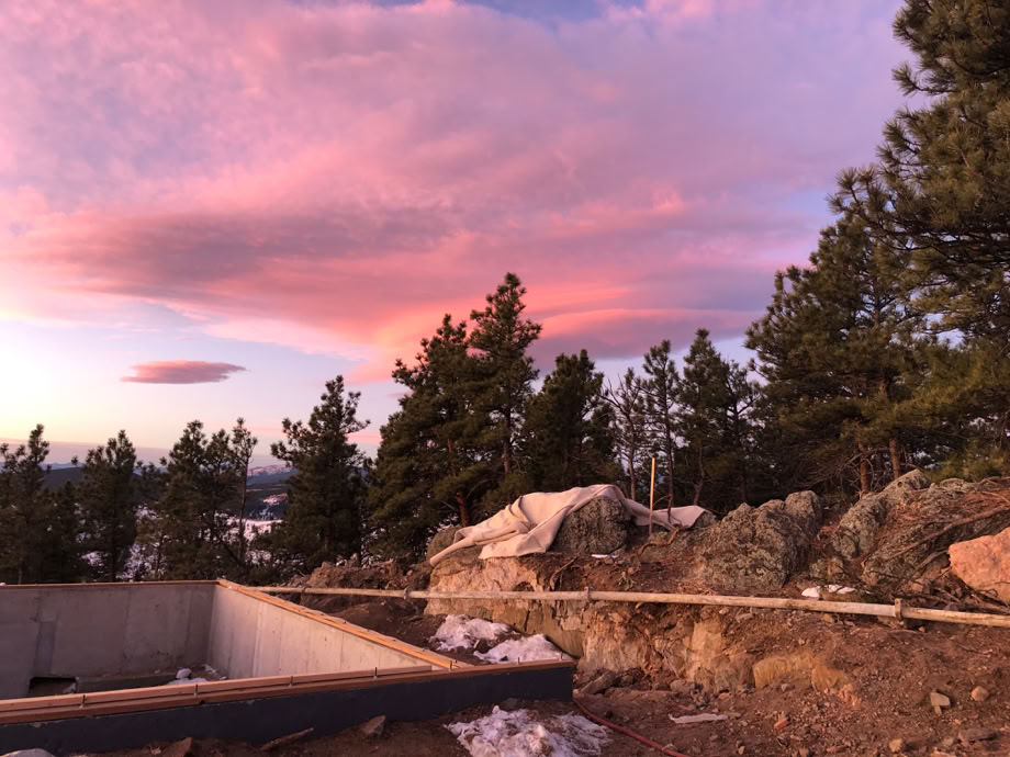 It’s now 7:00 and the sunrise color is being picked up by some mountain wave clouds to the west of us. That pipe in the foreground is what will carry the concrete from the pumper to the flex house in the pool.