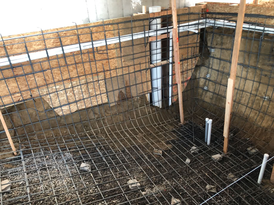 The pool uses a completely different and much less expensive way of placing concrete. Instead of building complete forms, like was done for the walls, a pool’s interior dimensions don’t have to be exact, so only the outer form is roughly constructed and the concrete is “shot” into place. This process is called shotcreting and we’ll get to see exactly how it works. There will be 32 yards of concrete shot today!