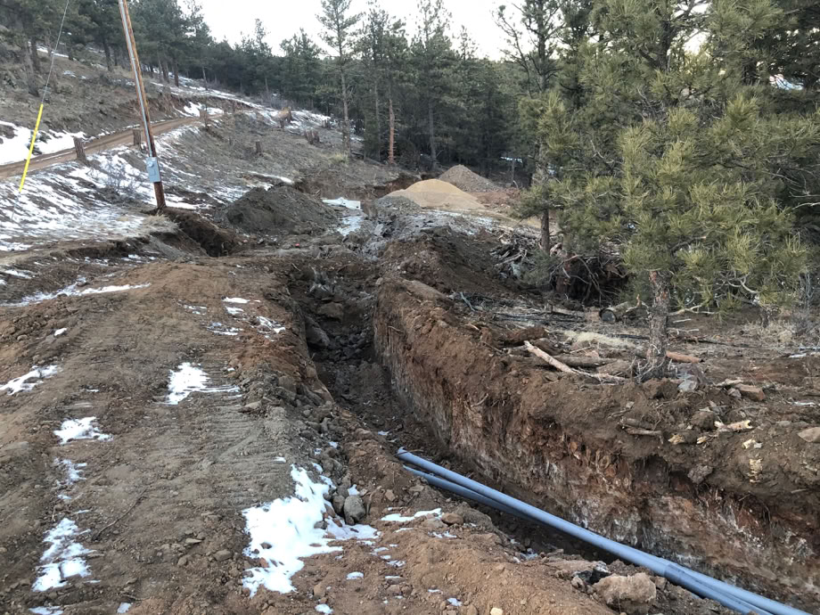 Here’s the perviously blasted part of the trench, with some conduit already placed in the foreground. Today’s blast, as you could see from the movie, started just this side of the power pole and goes to just this side of the far trees.