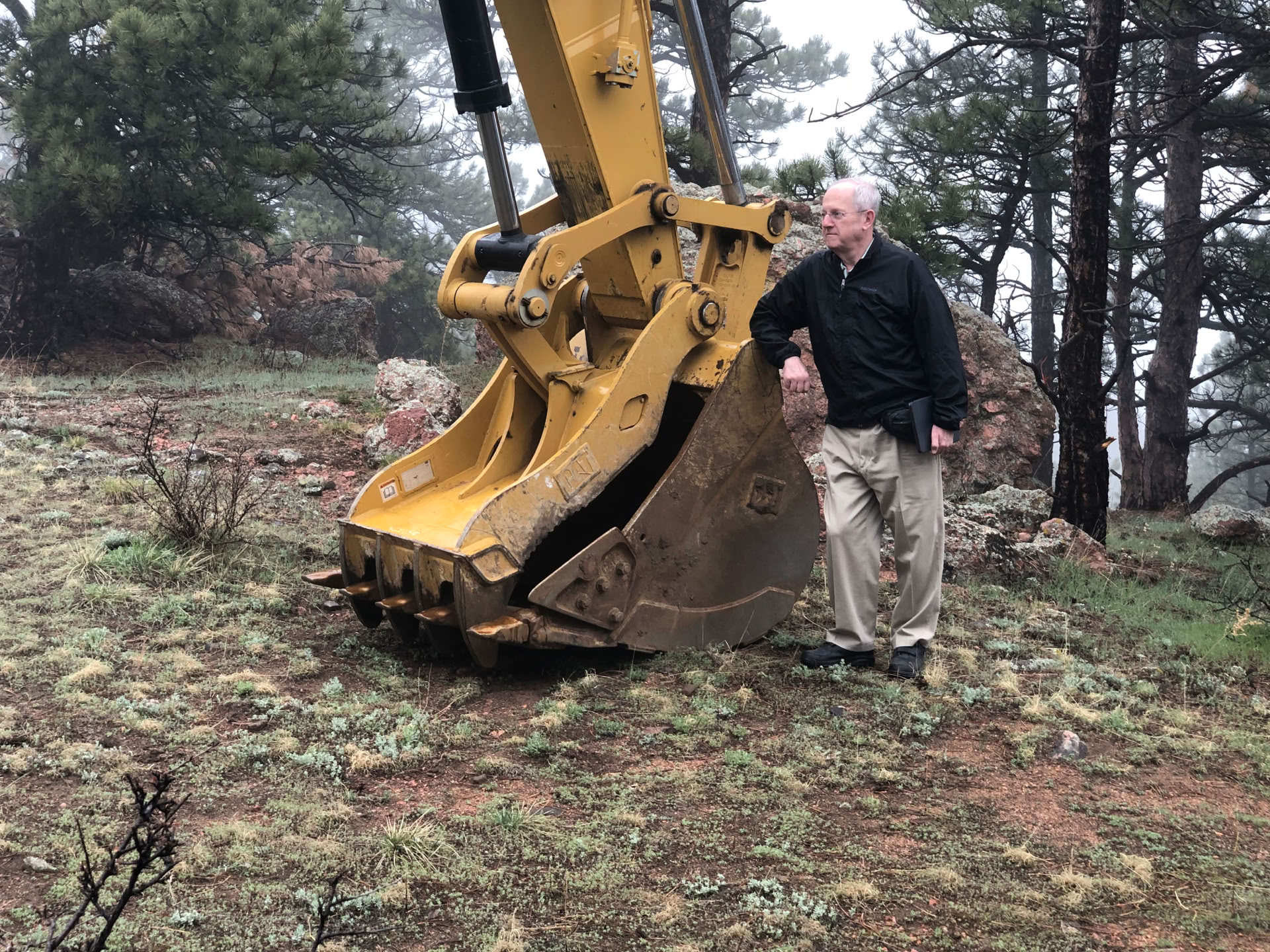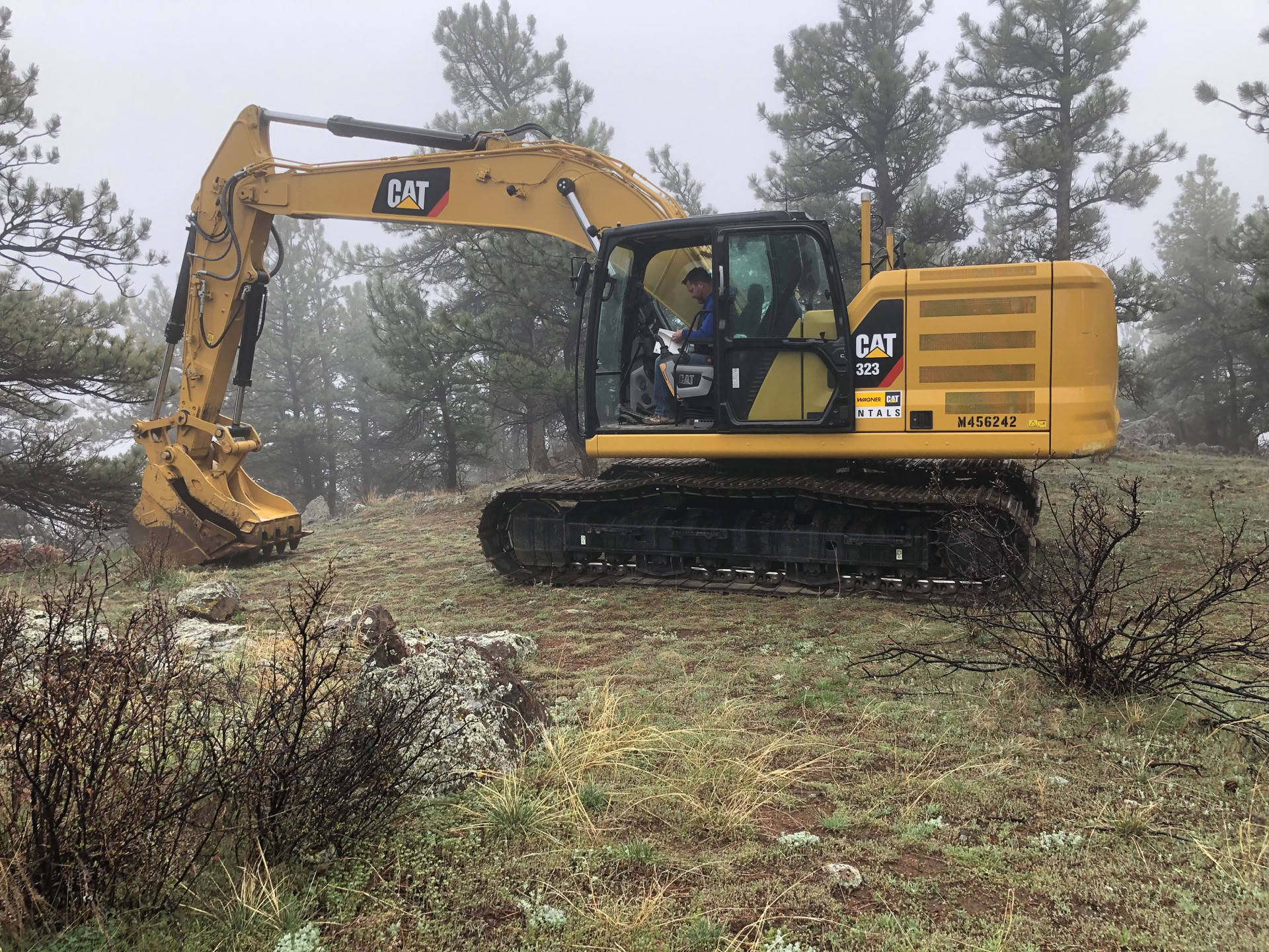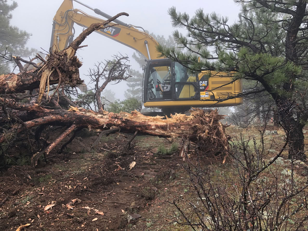 At long last! Today is the day! The machine started work at 9:43 AM. Its first job - clear out the trees! Its a Cat 323, weighing in at about 56,000 pounds. You don’t need a chainsaw when this beast can pull the trees out of the ground!