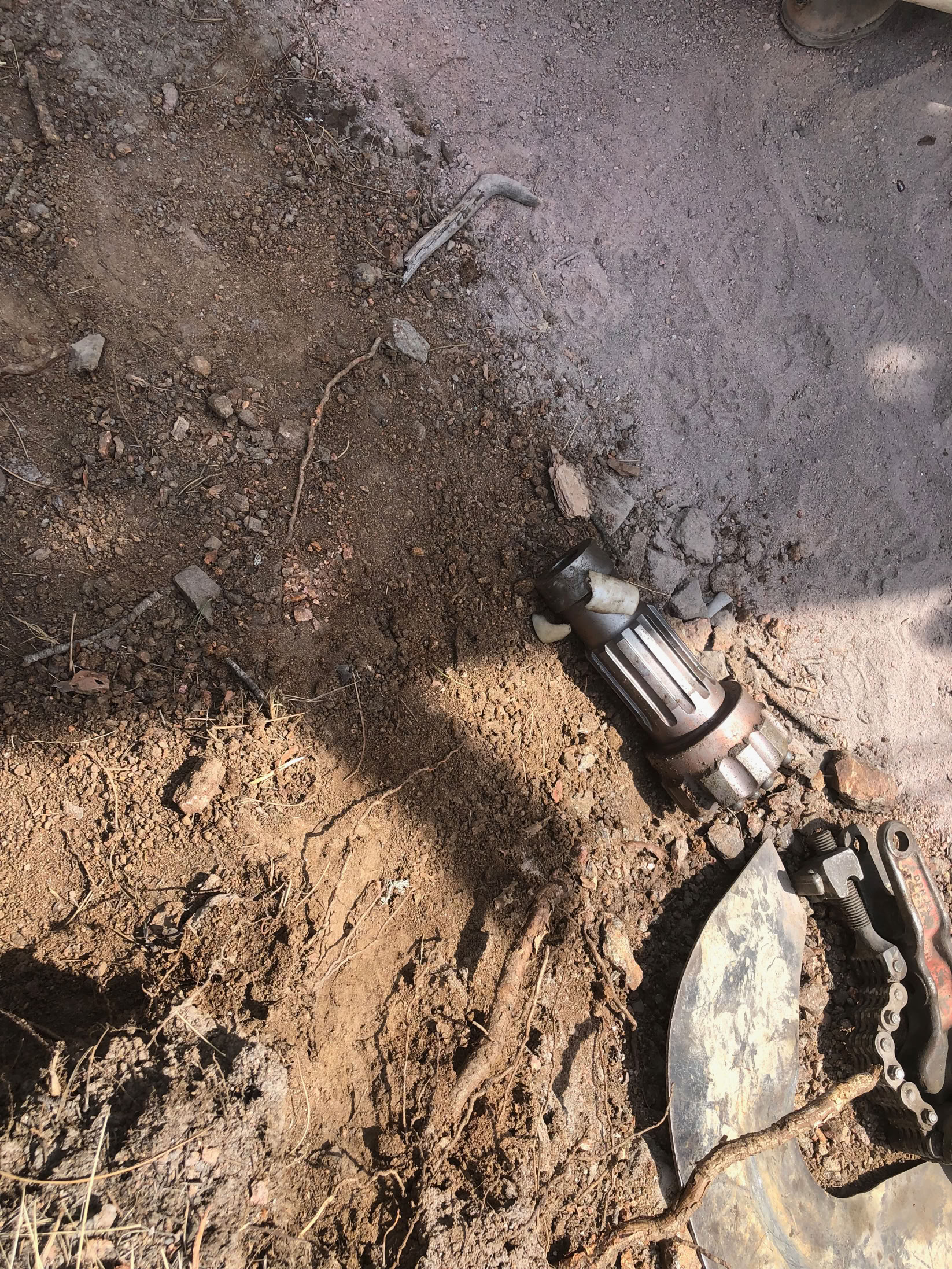 Yes, it was Monday. Here you can see the broken bit of plastic that required the drillers to “make a trip” up from about 600’. That tiny little bit of white plastic is the seal between the hammer and the bit. With that broken, the air wasn’t going to the bottom of the hole to pick up the broken rock.
